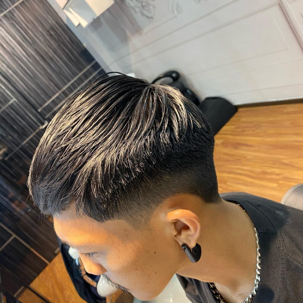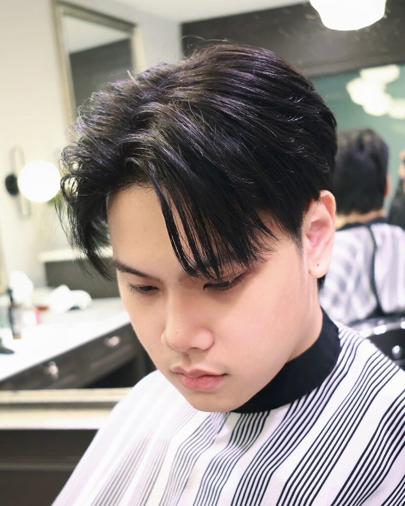 The two-block haircut is one of the most popular Asian men’s hairstyles, especially in Korean trends. It features shorter sides and back with longer hair on top, creating a soft yet structured look. This style is easy to maintain and works well with both straight and slightly wavy hair textures.