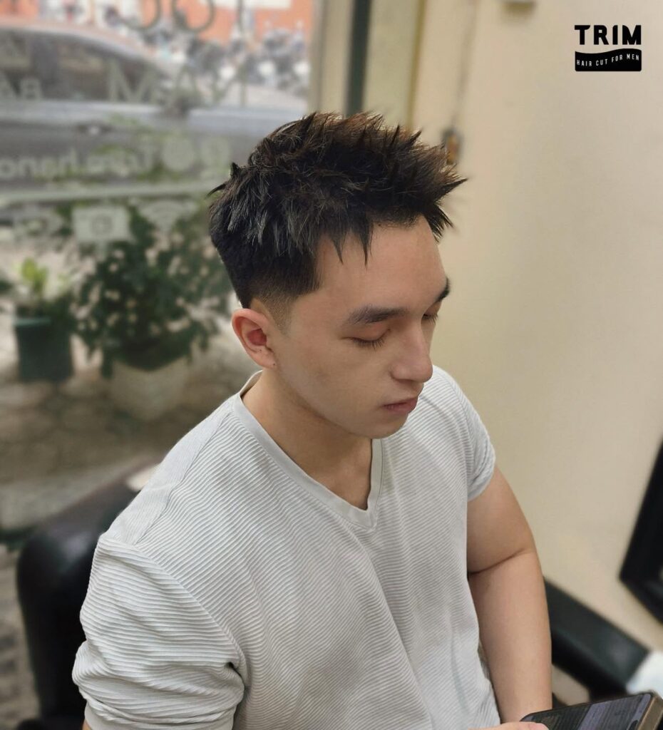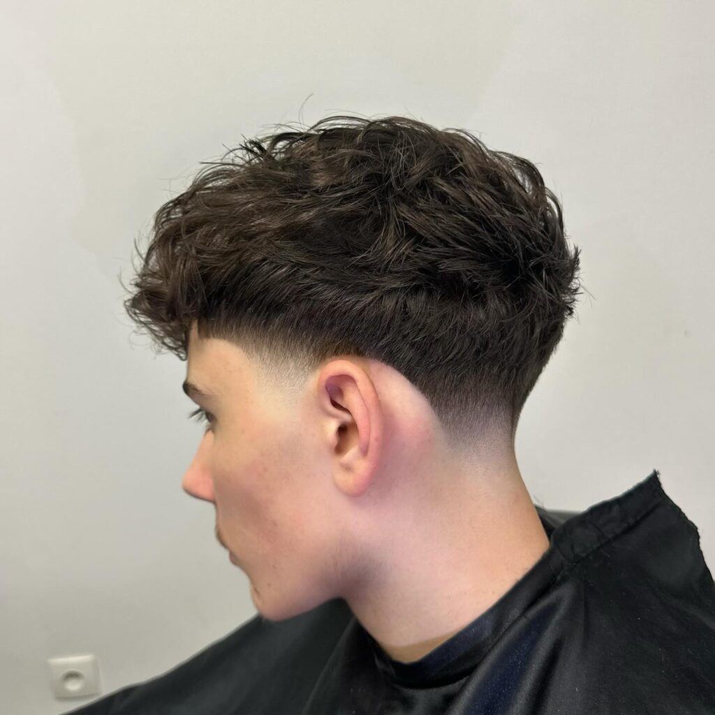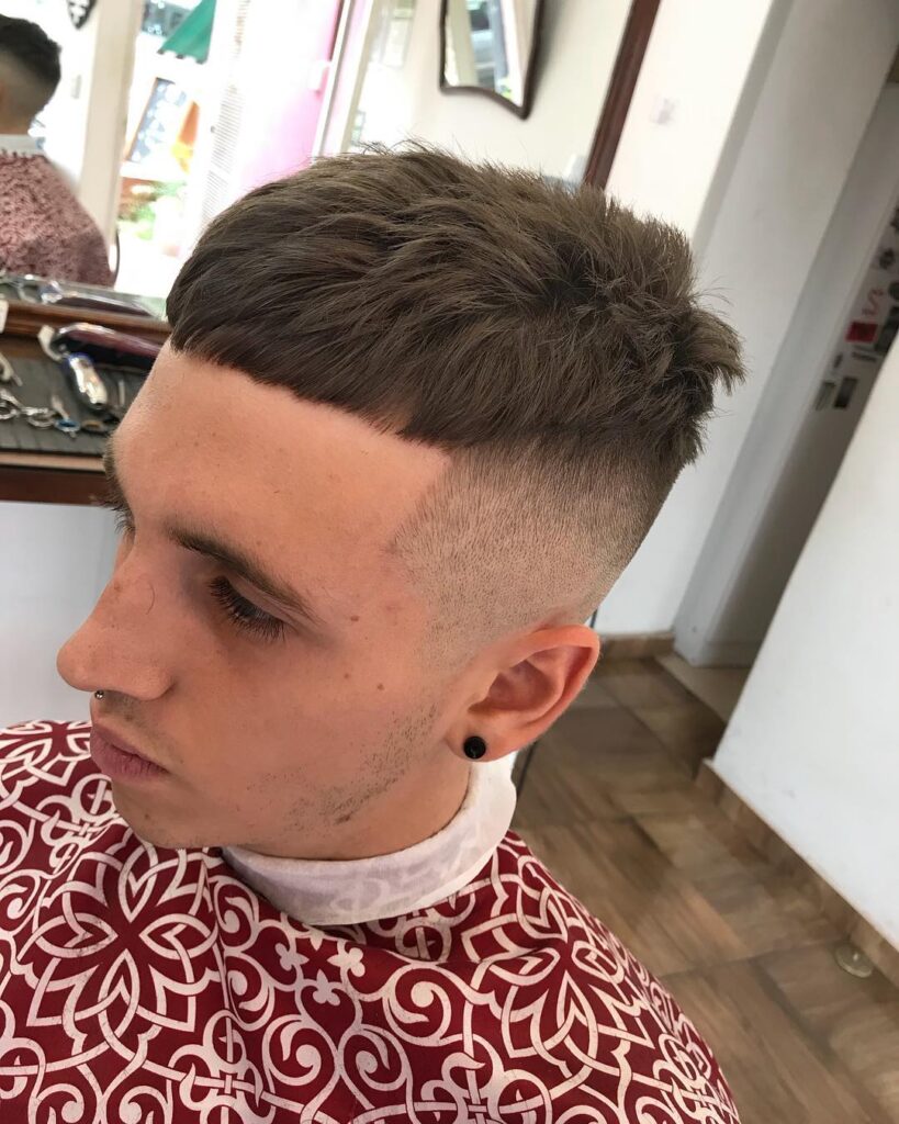 A messy fringe cut brings a relaxed, youthful feel to the hairstyle. The uneven bangs add movement and soften facial features. It’s easy to style and ideal for men who like a casual, laid-back look.