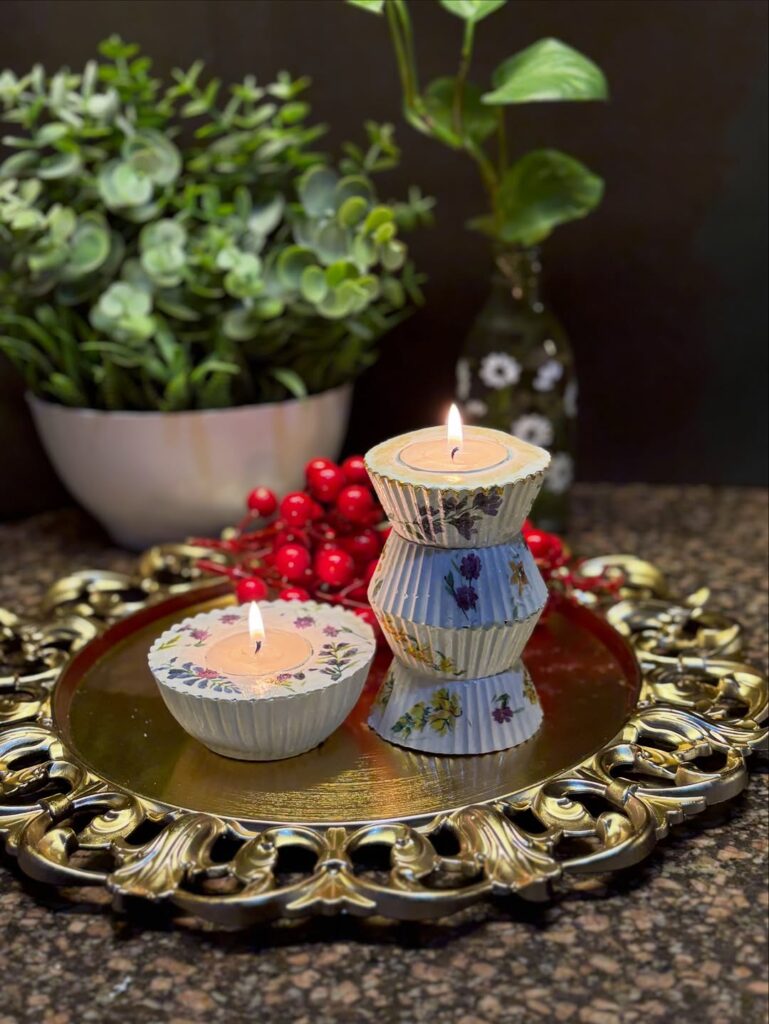 A single candle can look random on a surface, but grouping several candles together creates a styled display. Place three candles of different heights on a tray to add visual interest. The tray keeps everything organized while making the arrangement look intentional. This simple styling trick works perfectly on coffee tables, dining tables, or shelves.