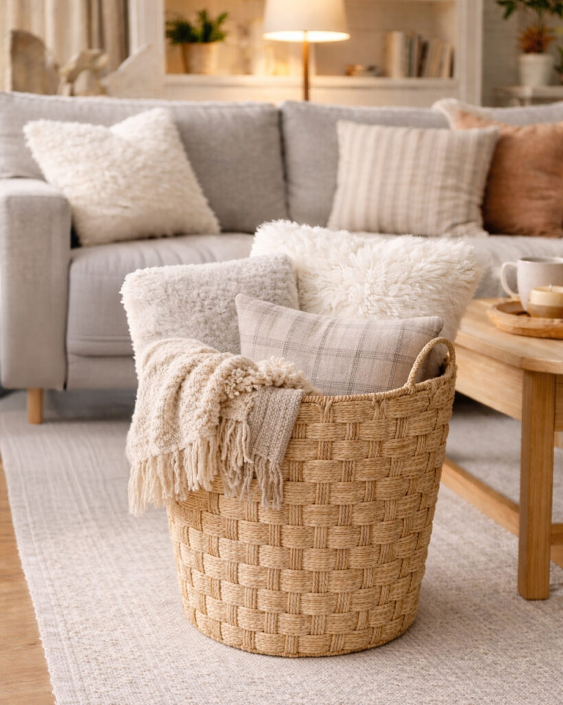 Woven baskets are both practical and decorative. They can store blankets, magazines, toys, or other everyday items while also adding natural texture to a room. Materials like seagrass, rattan, and water hyacinth look warm and organic. Whether placed next to a sofa or under a console table, baskets help keep the room organized while still looking stylish.