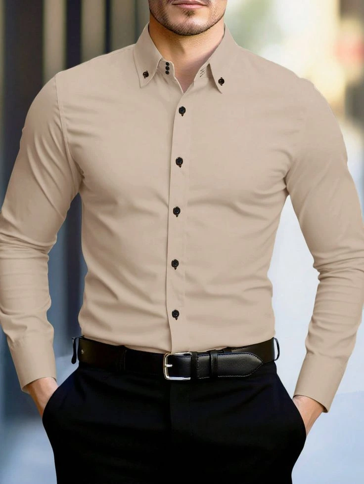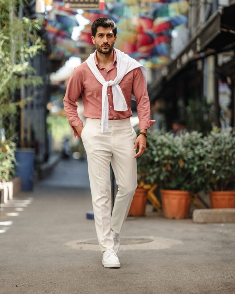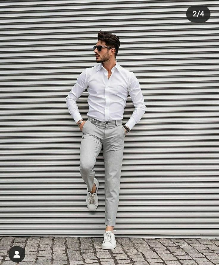 Sometimes the most impressive thing you can wear is nothing dramatic at all. A fitted beige or cream shirt, straight oatmeal or light grey trousers, and simple white or tan leather shoes. No patterns, no bold colors, no accessories competing for attention — just clean, well-fitted clothing in a cohesive neutral palette. The minimalist approach to business casual works because it lets the fit and the quality of the pieces do the talking. When everything fits well and sits in the same color family, the result looks deliberate and stylish in a way that’s very hard to achieve with a busier outfit.