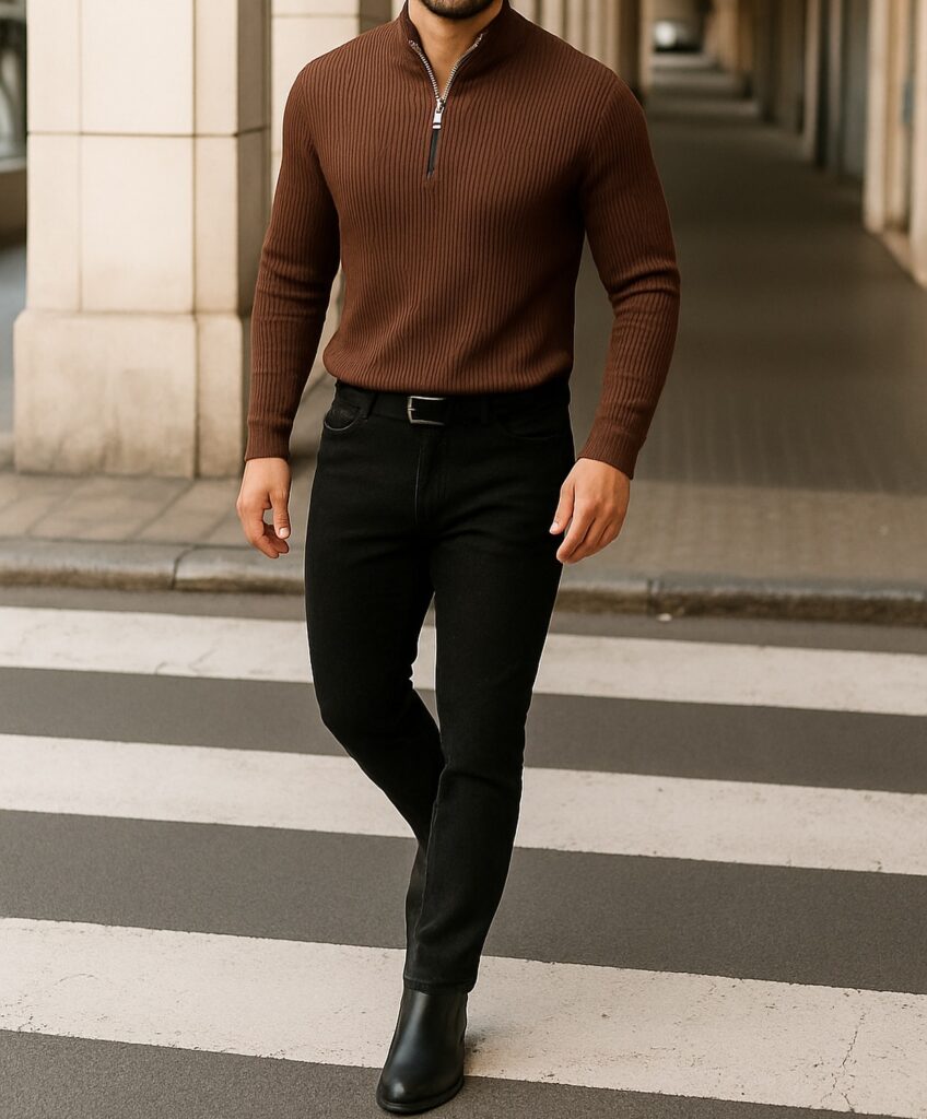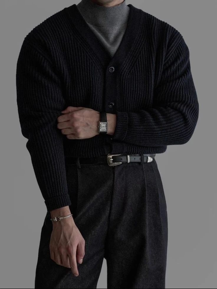 An all-black business casual outfit is one of the most underused options for men who want to look sharp with zero effort in the decision-making. Black slim trousers, a black fitted shirt or turtleneck, black leather shoes. The monochromatic effect creates a clean, elongated silhouette that always looks intentional. It’s versatile enough for the office and still works for an after-work dinner. The key is keeping the fit consistent — everything should be fitted at a similar level so the silhouette reads as one continuous line.