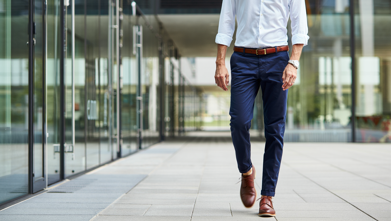 A well-ironed button-down shirt tucked into chinos or dress trousers, finished with a leather belt that matches your shoes — this is the kind of outfit that people notice without being able to explain exactly why. The matching belt and shoe combination is one of those small details that pulls everything together. It signals attention without screaming for it. Keep the shirt tucked cleanly, make sure the trousers aren’t too long, and the overall effect is a professional who understands the basics and got them right.