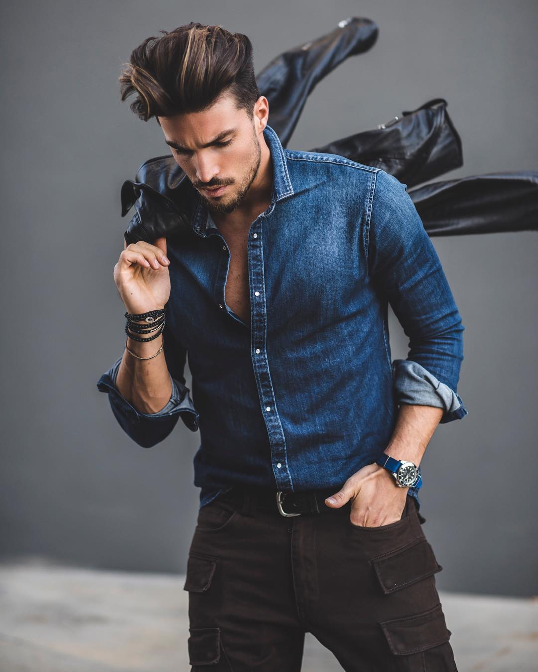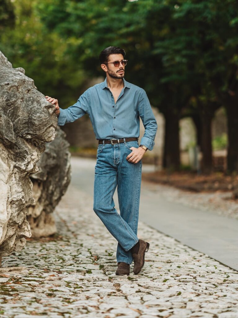 A denim shirt brings a bold yet casual edge to everyday fashion. It pairs well with black jeans, chinos, or even layered over a white t-shirt. This outfit is perfect for street-style inspired casual looks. Keep accessories minimal for a clean finish.
