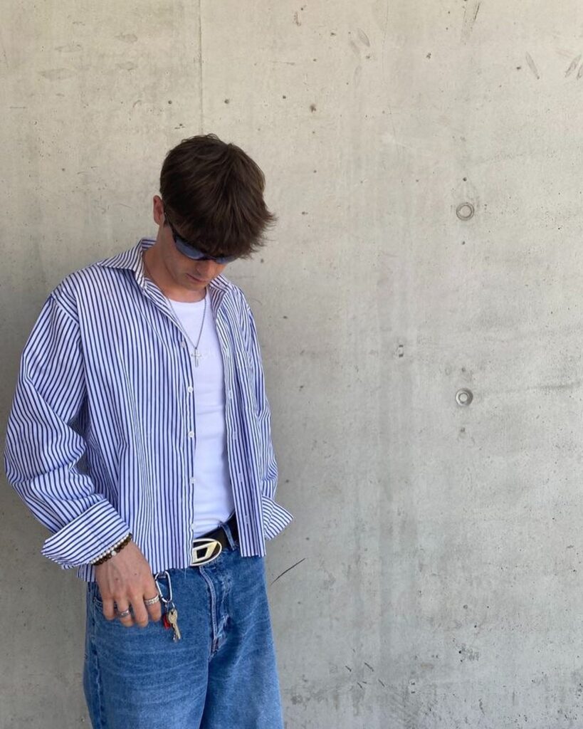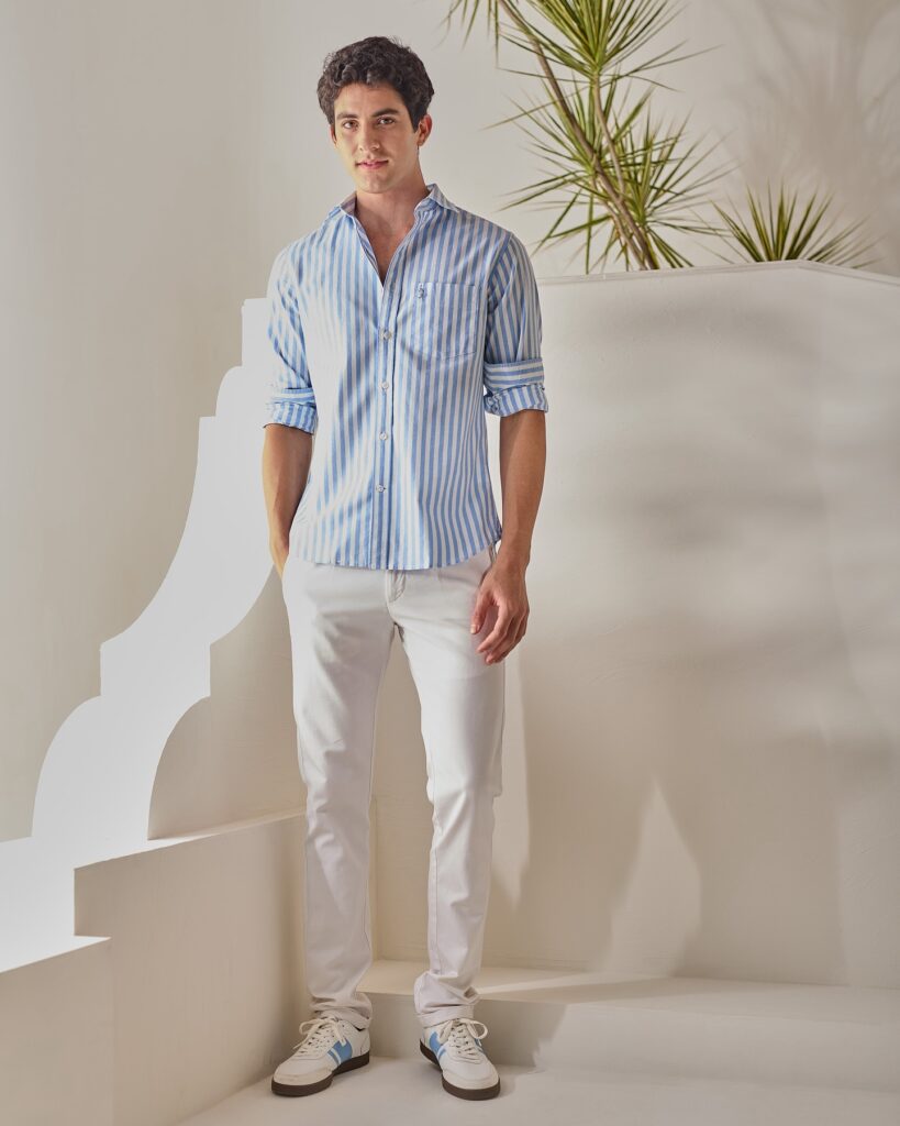 Striped shirts add subtle detail while keeping the outfit casual and clean. They work well for daily wear without looking overdone. Pair with solid-colored pants to balance the look. This outfit is perfect for casual lunches or daytime outings.
