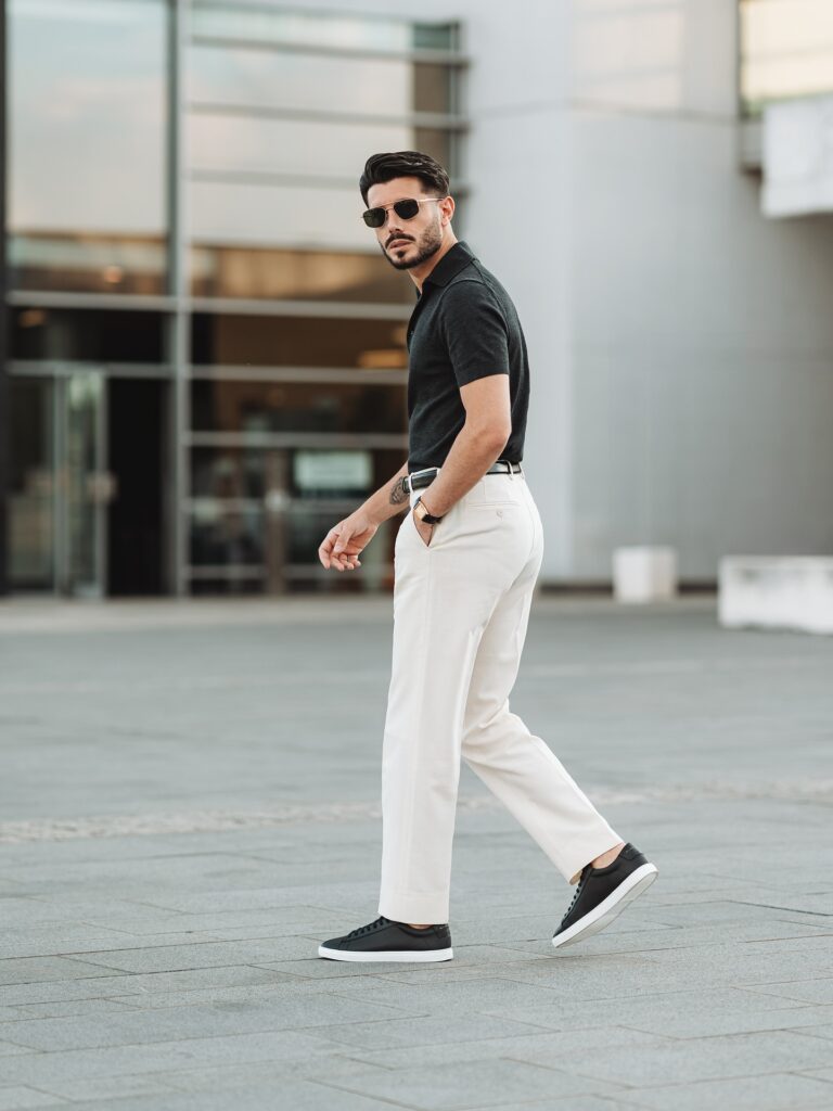 Pairing a casual shirt with sneakers creates an easygoing and youthful look. This combination works for daily errands, casual hangouts, or travel days. Keep the shirt untucked for a relaxed vibe. White or neutral sneakers keep the outfit balanced.