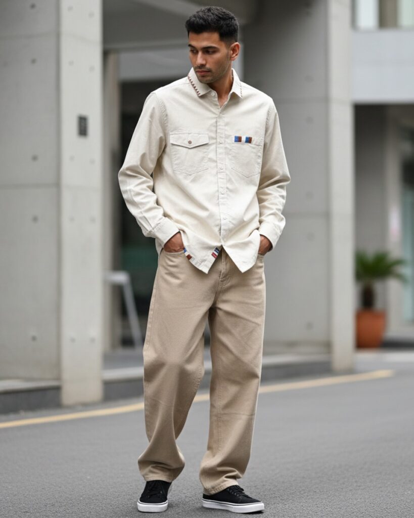 Neutral tone shirts like beige, cream, or gray create a calm and stylish casual outfit. These shades are easy to mix and match with most bottoms. The look feels modern, clean, and effortlessly put together. Pair with white sneakers for a fresh finish.