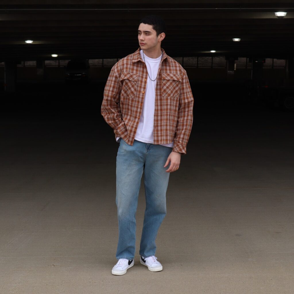 Checked shirts add a classic and slightly rugged charm to casual outfits. They pair perfectly with jeans or basic trousers for an everyday look. This style is easy to layer over a plain tee for added versatility. Sneakers or boots both work well with this outfit.