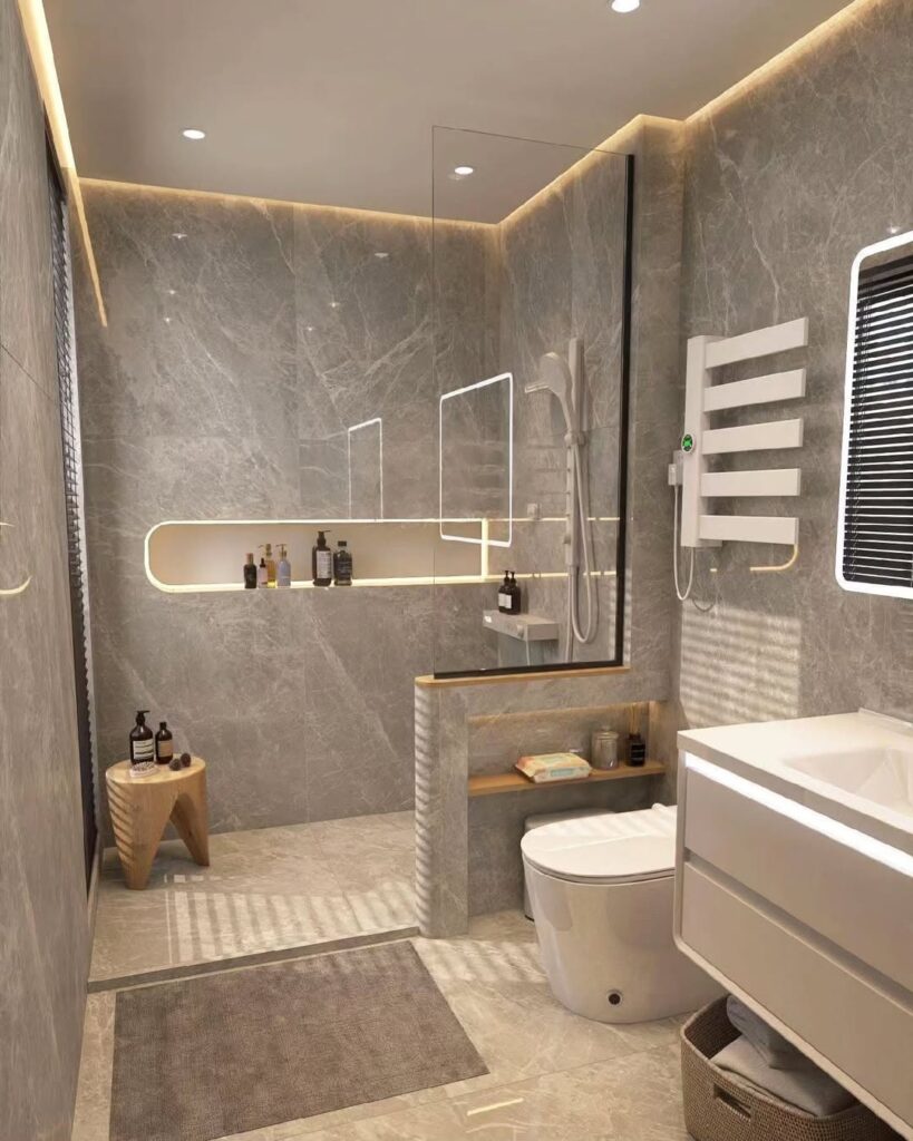 Bathrooms can look luxurious with just a few thoughtful details. Matching hardware such as towel holders, faucets, and hooks creates a clean and cohesive look. Soft towels, a small plant, and decorative soap dispensers can make the bathroom feel more like a spa. Keeping the counter organized with trays or containers also improves the appearance of the space.