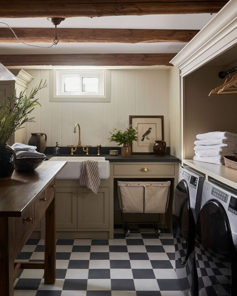 The laundry room is a functional space, but it can still look attractive and organized. Shelves with storage baskets help keep cleaning supplies tidy. A soft wall color and a few decorative touches like a plant or framed print can make the space feel more pleasant.