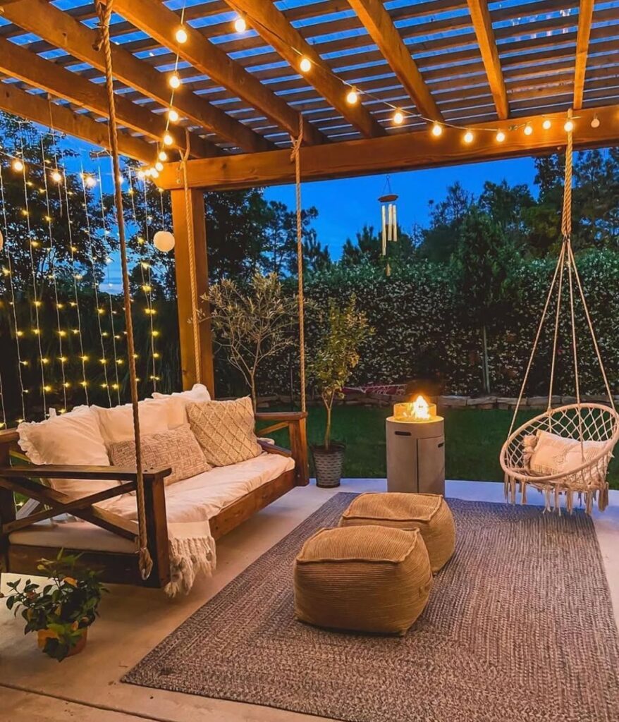 An outdoor patio can act as an extension of the home. Comfortable seating such as chairs or a small sofa allows the area to be used for relaxing or entertaining. Outdoor cushions, string lights, and potted plants create a cozy atmosphere. An outdoor rug can define the seating area and make the patio feel like a true outdoor living room.