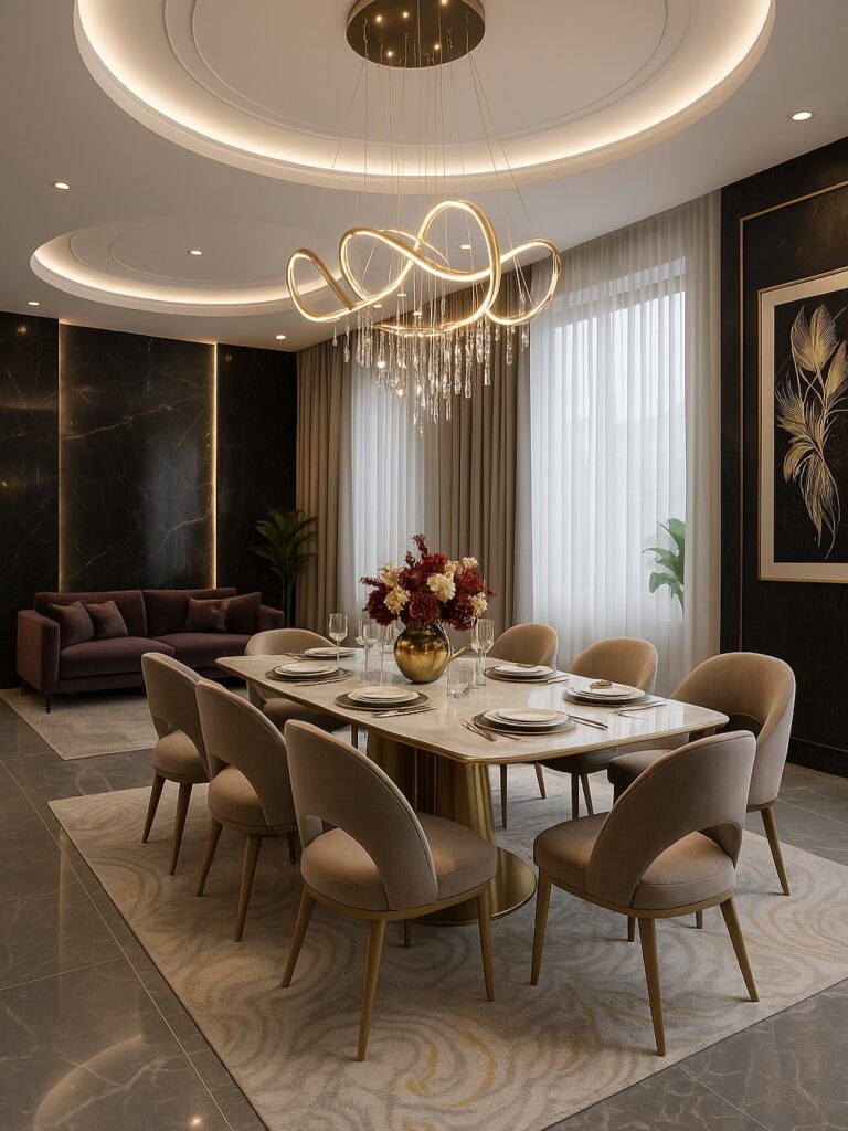 The dining room is where people gather to share meals and conversations, so it should feel warm and inviting. A dining table that fits the room size comfortably is essential. Comfortable chairs and a stylish pendant light above the table help define the space. A simple centerpiece like flowers, candles, or a decorative bowl keeps the table looking elegant without making it feel cluttered.