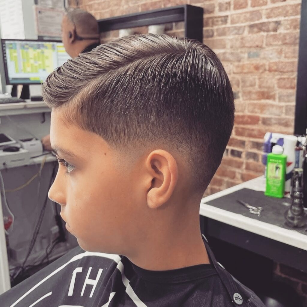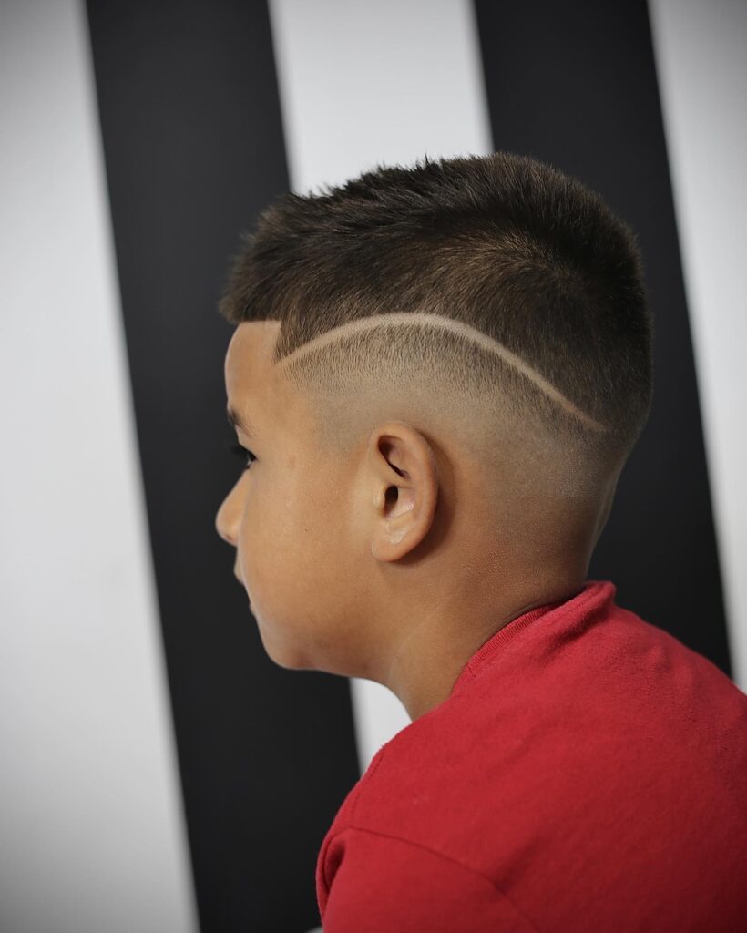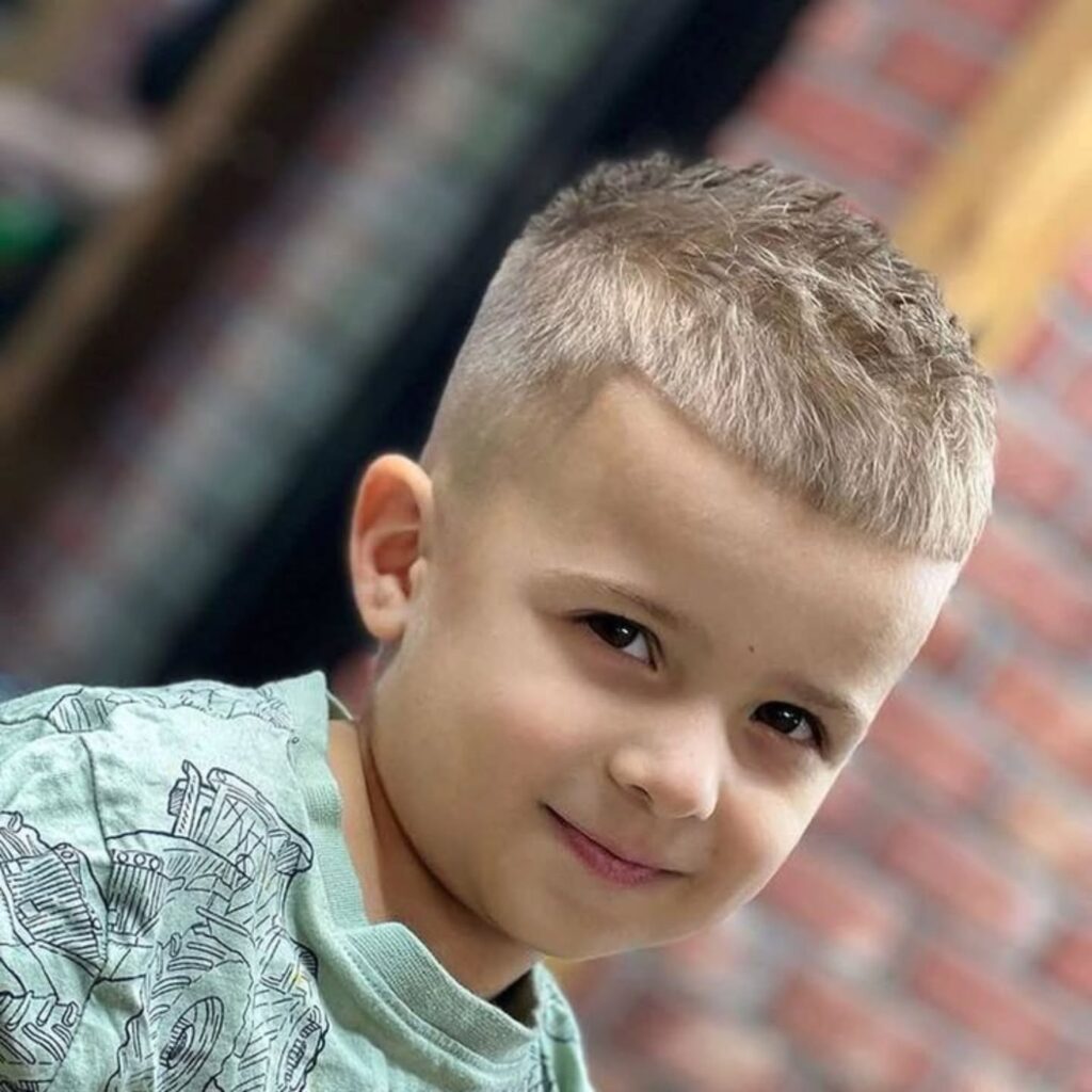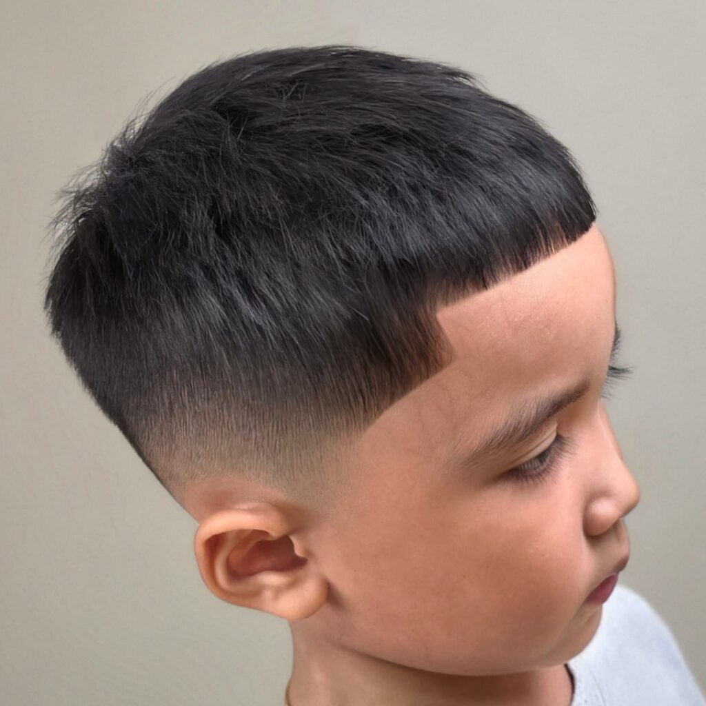 A buzz cut with taper combines simplicity with a clean finish. The tapered edges around the neck and sides make the haircut look sharper. It is perfect for boys who prefer very short hair. This style is low maintenance and always looks tidy.
