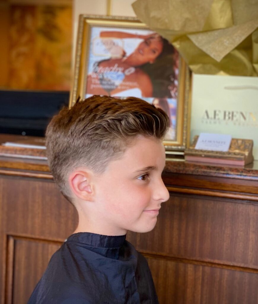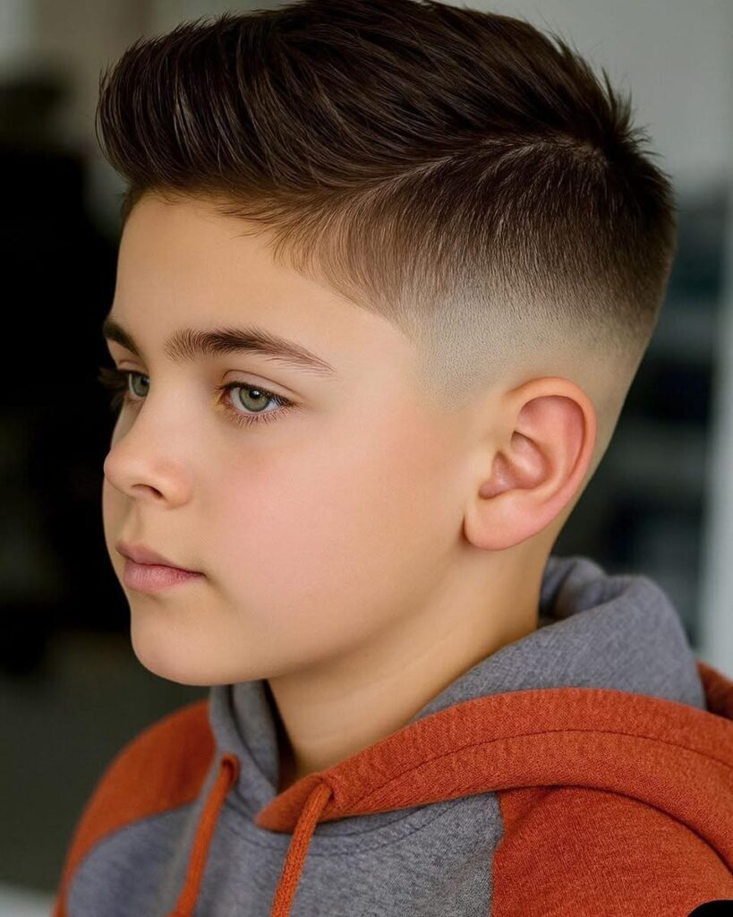 A short quiff haircut adds volume without being too dramatic for school. The top is slightly lifted while the sides remain clean and tidy. It suits boys who like a stylish but controlled look. This haircut works best with minimal styling products.