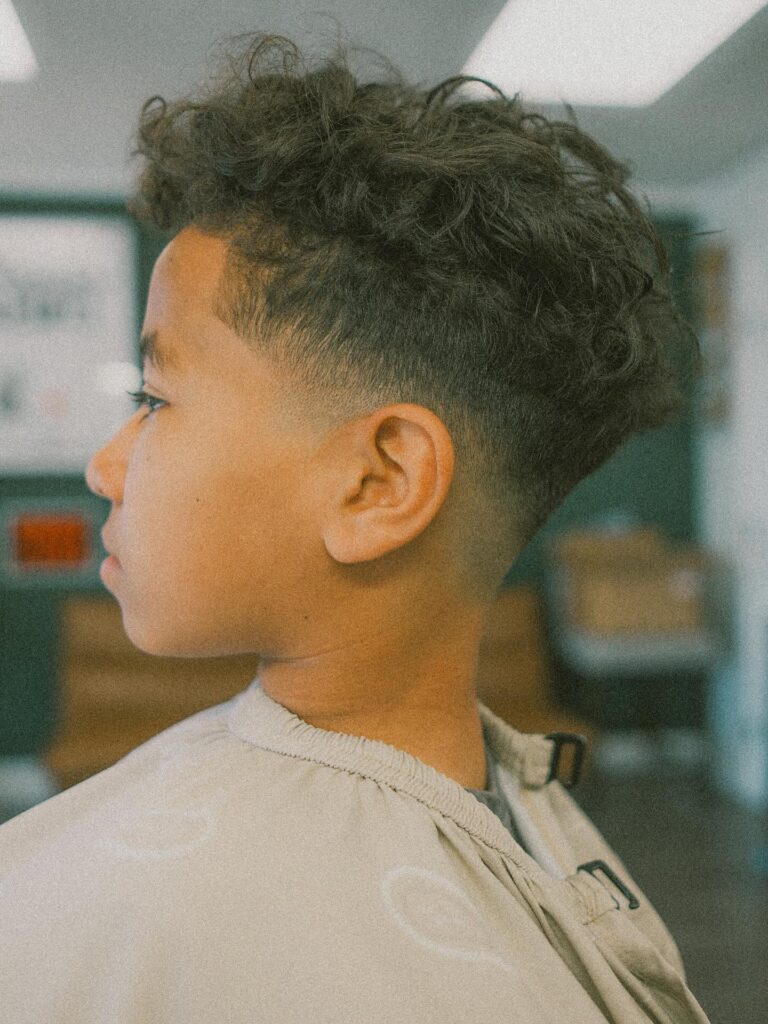 The neat curly top with taper allows natural curls to shine while keeping the sides clean. The tapered sides help control volume and maintain a tidy look. This haircut is perfect for boys with curly hair. It balances style and school-appropriate grooming.