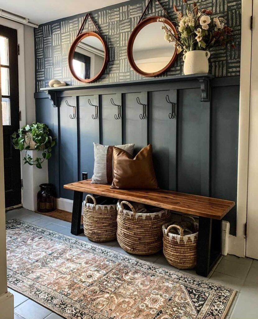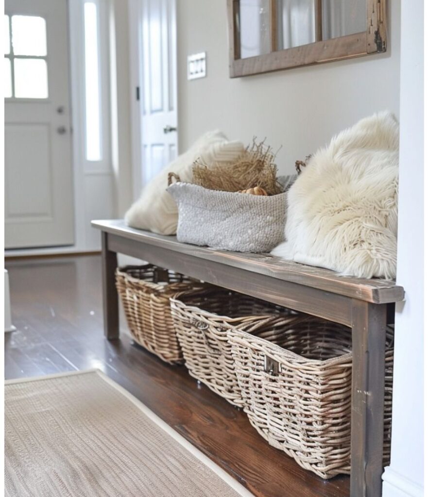 Basket storage is a practical and decorative solution for busy entryways. Use woven baskets to store shoes, scarves, or bags while keeping the area tidy. They add texture and warmth to the space effortlessly.