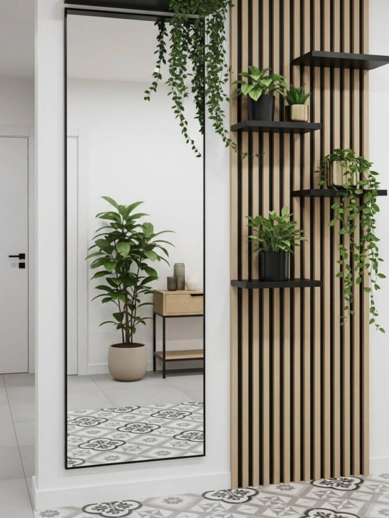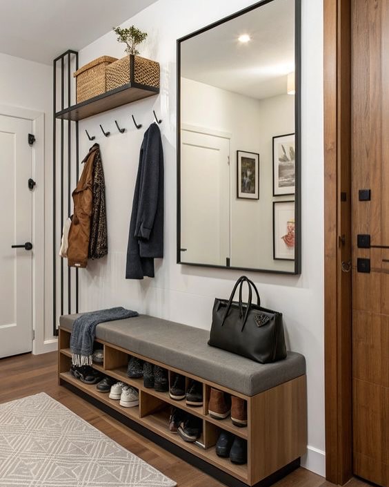 Floating shelves add storage without taking up floor space. Use them to display decor, plants, or small baskets for essentials. This setup is perfect for narrow entryways or minimalist designs.