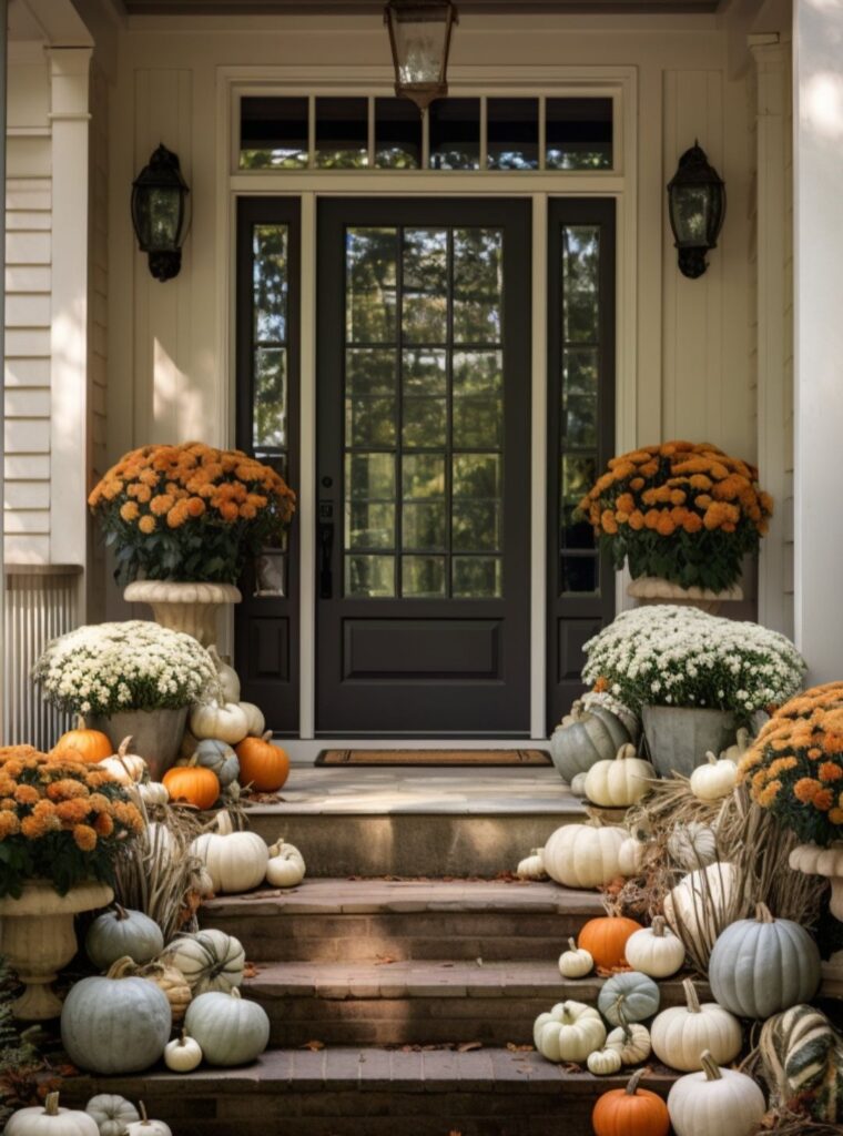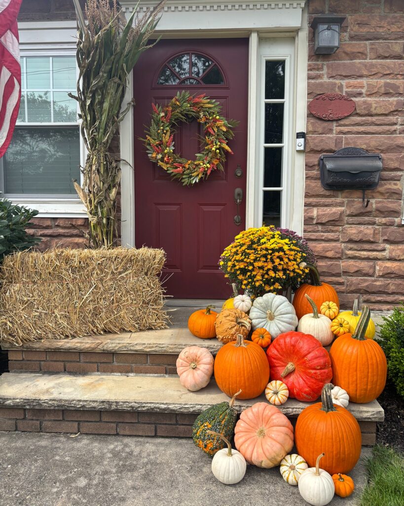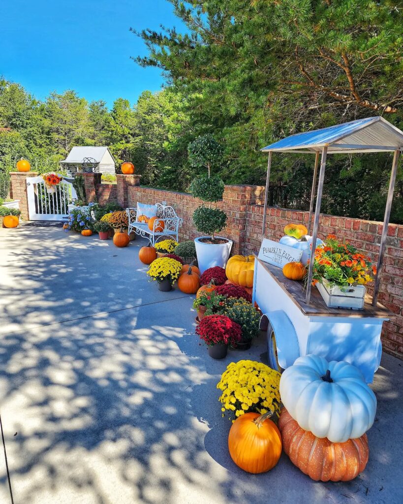 A front yard pumpkin patch creates a playful yet classic fall display. Group pumpkins together on grass, near trees, or by the porch. This idea works well for families and adds instant seasonal charm.
