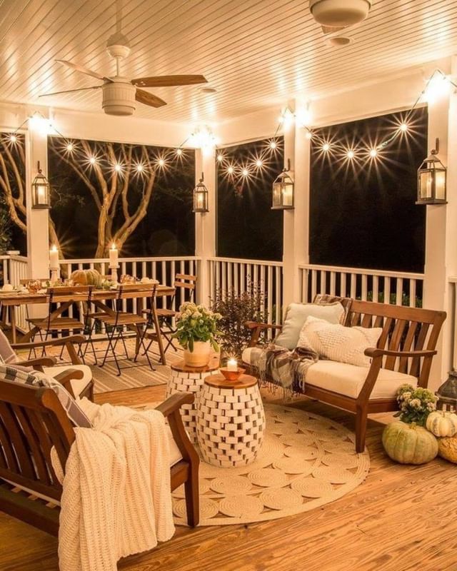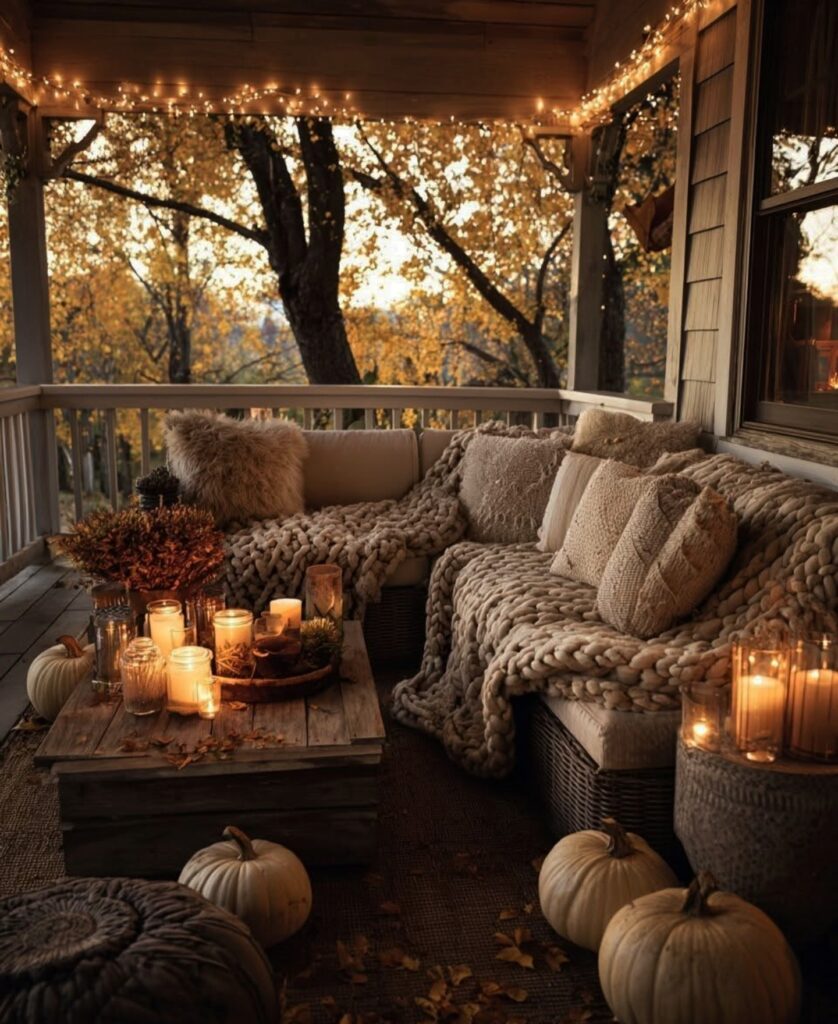 Adding throws to outdoor seating makes patios feel warm and inviting during fall. Choose cozy fabrics in autumn colors or plaid patterns. This décor idea combines comfort and seasonal style effortlessly.