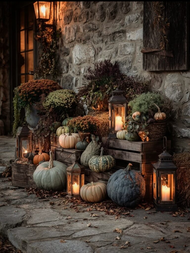 Outdoor lanterns add soft lighting and instant coziness to any fall setup. Place lanterns near doorways, along steps, or on patios with candles or LED lights inside. Paired with pumpkins or greenery, they create a classic autumn glow.