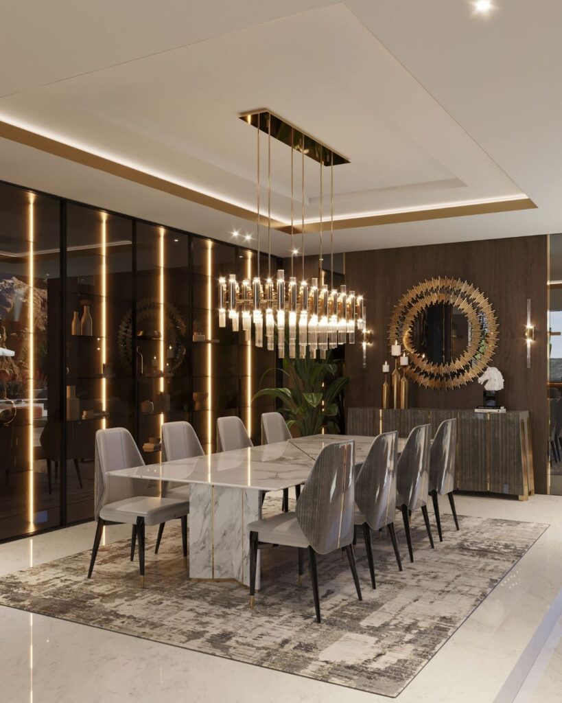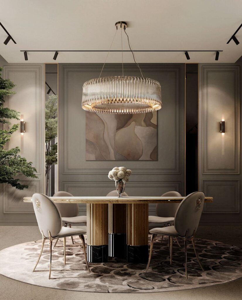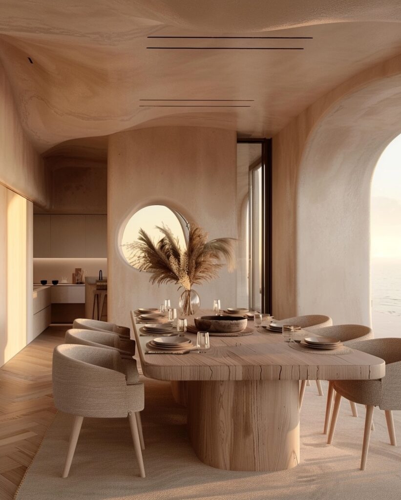 A modern minimal dining room focuses on clean lines, simple furniture, and clutter-free styling. Neutral colors, sleek dining tables, and subtle lighting keep the space calm and sophisticated. This style is perfect for creating an airy, open feel while maintaining elegance. Less décor ensures the dining area feels spacious and easy to maintain.
