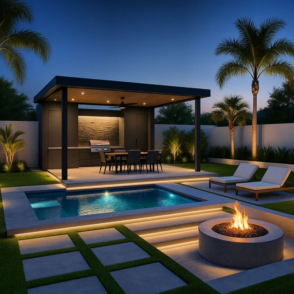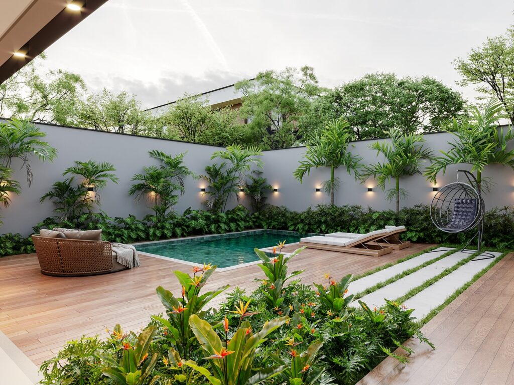 A poolside jacuzzi creates a resort-inspired outdoor space. It offers flexibility, allowing users to switch between swimming and relaxing. Coordinated tiles and lighting help unify the pool and jacuzzi visually.