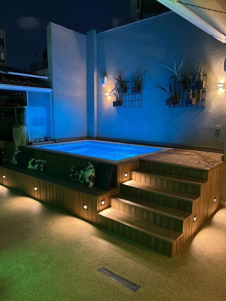 A deck-integrated jacuzzi blends seamlessly into wooden decking, creating a polished and built-in look. It works especially well for backyards and patios where space needs to feel organized and intentional. This setup also makes entry easier and allows space for seating or loungers around the jacuzzi.