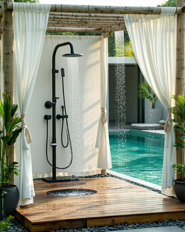 An outdoor shower next to a jacuzzi adds convenience and hygiene. It allows users to rinse off before and after soaking. This setup is especially useful for poolside or garden-based jacuzzi areas.