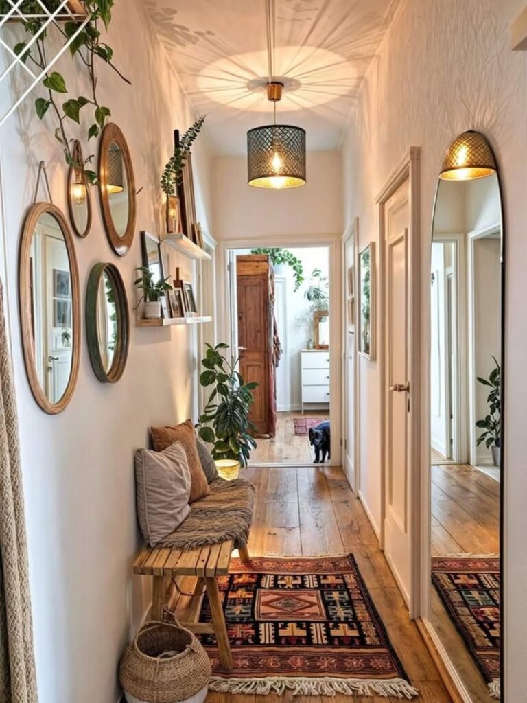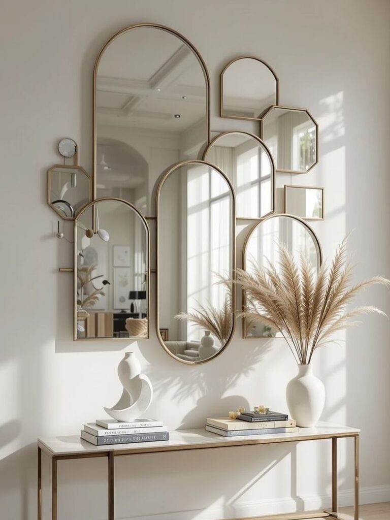 A mirror gallery wall is one of the most creative and visually layered mirror decor ideas for home hallways, living rooms, and entryways. Multiple mirrors of different shapes and sizes combine to create a captivating focal point that multiplies light and visual interest simultaneously. Furthermore, mixing round, square, hexagonal, and ornate framed mirrors creates a sophisticated, curated collection that feels genuinely personal. As a result, the wall gains depth, dimension, and personality that a single mirror simply cannot achieve. Additionally, hanging mirrors at varying heights and angles adds rhythm and movement to the gallery arrangement. This prevents the display from feeling flat or too symmetrical. Moreover, a mirror gallery wall transforms a plain hallway into a stylish, visually interesting space that impresses guests immediately. Pair mirrors with framed artwork in the arrangement to add contrast between reflective and matte textures. Therefore, a gallery wall of mixed mirrors is a rewarding, highly customizable home decor project that suits any interior style confidently.