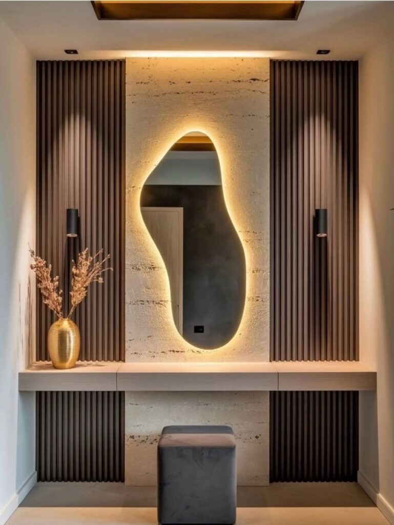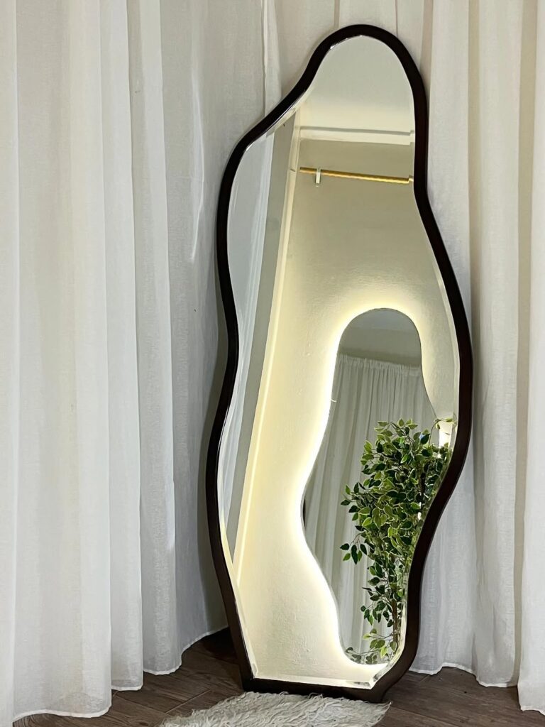 Wavy, cloud-shaped, and freeform organic mirrors are one of the boldest and most exciting mirror decor ideas for home interiors in 2025. These unconventional shapes move beyond the traditional round and rectangular formats entirely. Furthermore, wavy mirrors add a cheerful, irreverent energy to entryways, eclectic bedrooms, and creative living spaces. They combine genuine artistic personality with practical reflective function in one visually memorable piece. Additionally, teardrop-shaped mirrors are stepping out of boutique showrooms and into homes with impressive speed. Their organic profile smooths straight edges and adds a whimsical quality that suits modern and natural interiors equally well. Moreover, cloud and blob-shaped mirrors work beautifully as standalone statement pieces above console tables or as part of a larger mixed-mirror gallery arrangement. Designers like Justina Blakeney have popularized these funky silhouettes globally. Furthermore, wooden or clay-textured frames on organic mirrors ground the look with an artisanal, natural quality. Therefore, a wavy or freeform organic mirror is the single most personality-driven mirror choice available in 2025 for any confident home decorator.