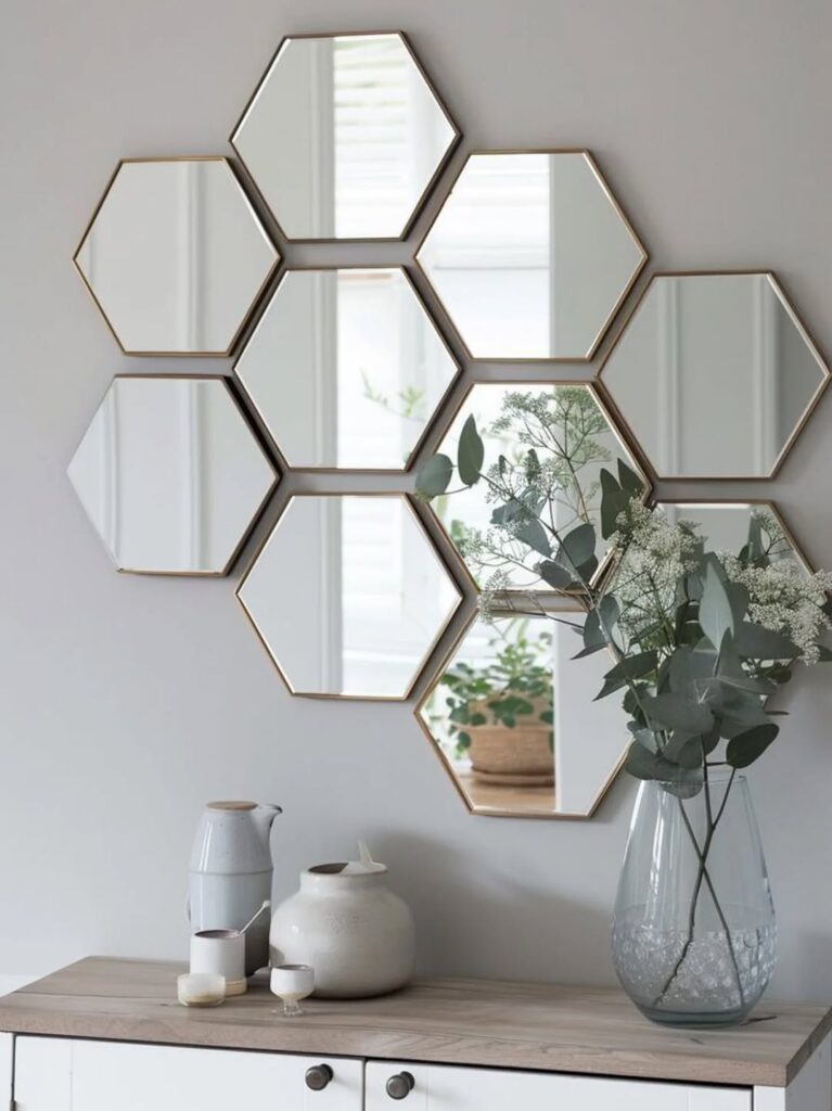 Geometric mirrors are one of the most artistically exciting mirror decor ideas for home spaces that want a contemporary edge. Hexagonal, diamond, and angular mirror shapes add structure, rhythm, and bold visual personality to any wall. Furthermore, layering different geometric shapes creates a sophisticated visual composition throughout the space. Start with one large hexagonal or circular mirror as the anchor piece. Then add smaller geometric shapes around it for balance and visual depth. Additionally, this approach works particularly well in living rooms and entryways where guests first encounter the home’s design aesthetic. Modular sticky mirror tiles offer a flexible, DIY-friendly version of geometric mirror decor. These renter-friendly pieces can be arranged in endless configurations on any wall surface. Moreover, a series of hexagonal mirrors in a kitchen creates a modern, light-reflective surface that makes compact cooking spaces feel visibly larger. Therefore, geometric mirror arrangements suit confident, design-forward homeowners who want mirror decor that feels genuinely artistic and bold.
