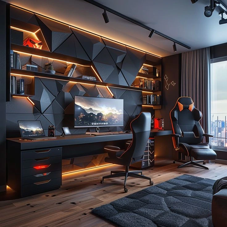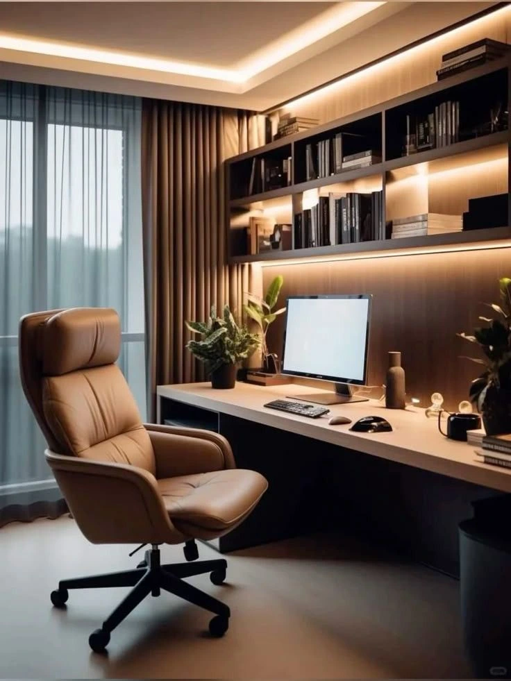 Built-in shelving changes what a room feels like at a pretty fundamental level. Floor-to-ceiling shelves around a desk make the whole space feel designed rather than pieced together — like someone thought about this room specifically, not just filled it with furniture that happened to be available. Books, plants, objects you like looking at, and the practical storage you actually need all find a home without any of it landing on the desk. Paint the shelves the same color as the walls and they disappear into the room in the best possible way. It’s one of those things you notice every day.