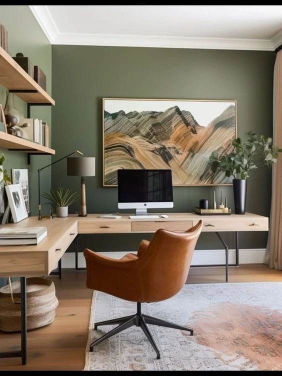 Green has a way of softening a room without making it feel sleepy — it’s one of those colors that sits right in the middle of calm and alive. You don’t have to go all-in either. One olive green wall behind the desk, a few plants on the shelves, maybe a green lamp or some small accessories in that color family. Paired with white or natural wood, it feels fresh and current without trying too hard. It’s a small addition to the room that changes the feeling of the whole space, especially during long hours at the desk.