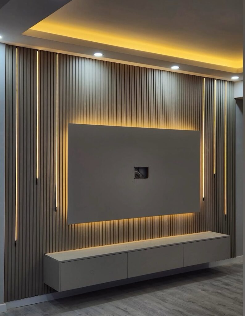 A wood panel accent wall behind the sofa or the main seating area is the living room wall treatment that produces the most dramatic transformation of the space per square meter installed. The texture of wood — whether natural timber panels, engineered wood strips, or a slatted wood screen — introduces a material warmth and a visual depth to the room that paint and wallpaper do not replicate. A slatted wood panel wall in a warm oak or walnut tone behind a neutral sofa creates a backdrop that makes every piece of furniture in front of it look more considered and more expensive than it did against a painted wall. The wood does not need to be genuine timber to be effective — engineered panels and MDF profiles finished in a wood-look paint can achieve a similar visual result at lower cost. The accent wall principle — one wall treated distinctly from the others — focuses the visual impact of the material choice rather than diluting it across the entire room.