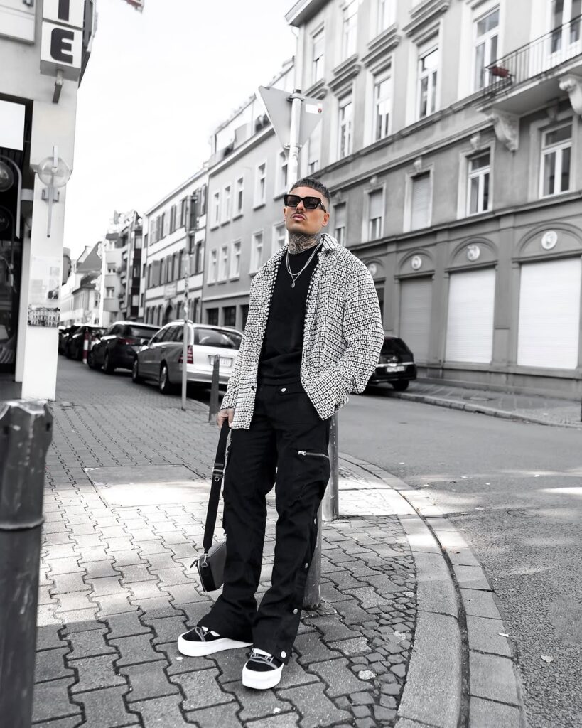 All-black in a streetwear context is a different outfit from all-black in a smart or formal context, and the difference is entirely in the pieces and their silhouettes. An all-black streetwear monochrome outfit — oversized black tee, black joggers or wide-leg trousers, black chunky sneakers or boots — has a visual weight and an urban authority that the same color in tailored pieces does not carry. The oversized proportions, the technical or casual fabrics, and the streetwear-specific footwear give the all-black palette a different kind of presence — one that communicates an awareness of contemporary urban style rather than formal dressing conventions. The interest within the outfit comes from the contrast between the different silhouettes and textures of each piece: a structured black overshirt against a softer black tee against a matte black technical trouser. All black, all intentional, all reading as a considered statement within a street style context.