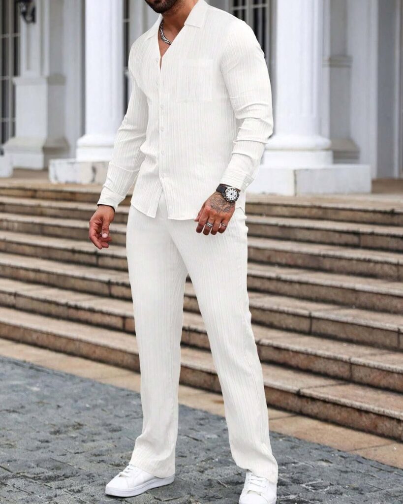 An all-white outfit requires a specific kind of confidence that not every man has arrived at, and that requirement is part of what makes it so striking when it is worn correctly. White communicates openness, cleanliness, and a particular ease with one’s own appearance that darker, more protective color choices do not carry in the same way. White linen shirt over white trousers with white leather shoes or sneakers — when every piece sits in the same white family and the fit of each piece is right, the outfit reads as deliberately composed rather than accidentally matching. The practical reality of keeping white clean in daily wear is a genuine consideration but also precisely what makes wearing it confidently feel like a statement. It reads best in summer and in warm climates where the white reflects light beautifully. In textures — linen, cotton twill, clean leather — the all-white monochrome outfit has a depth and a quality that its apparent simplicity does not immediately suggest.