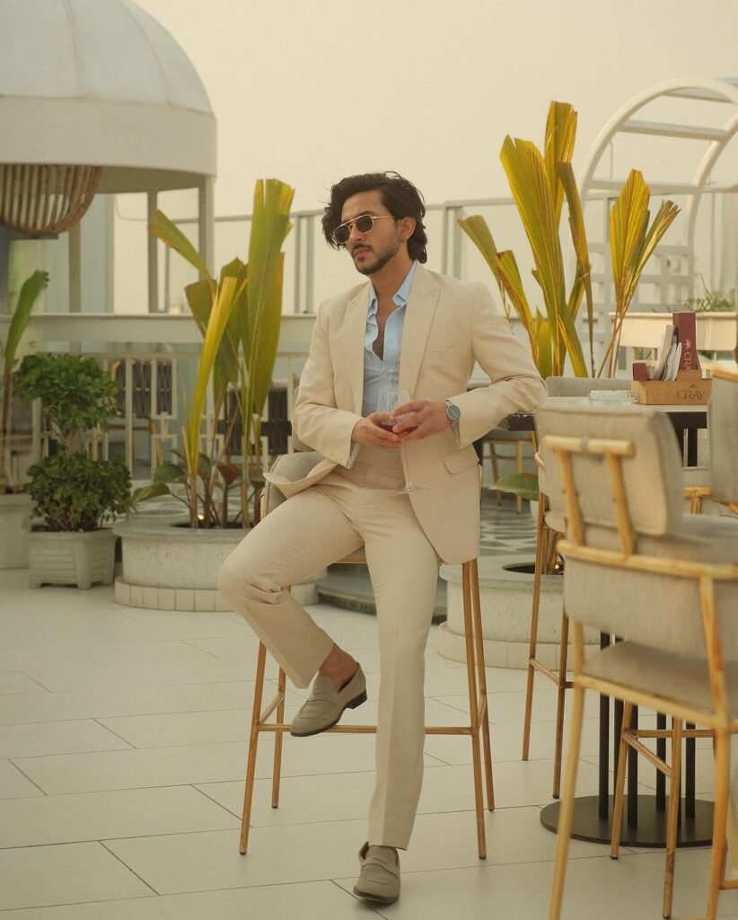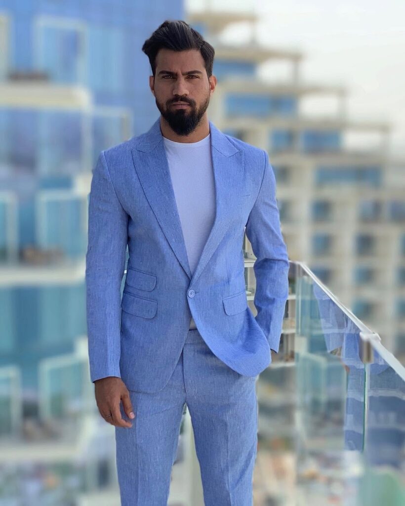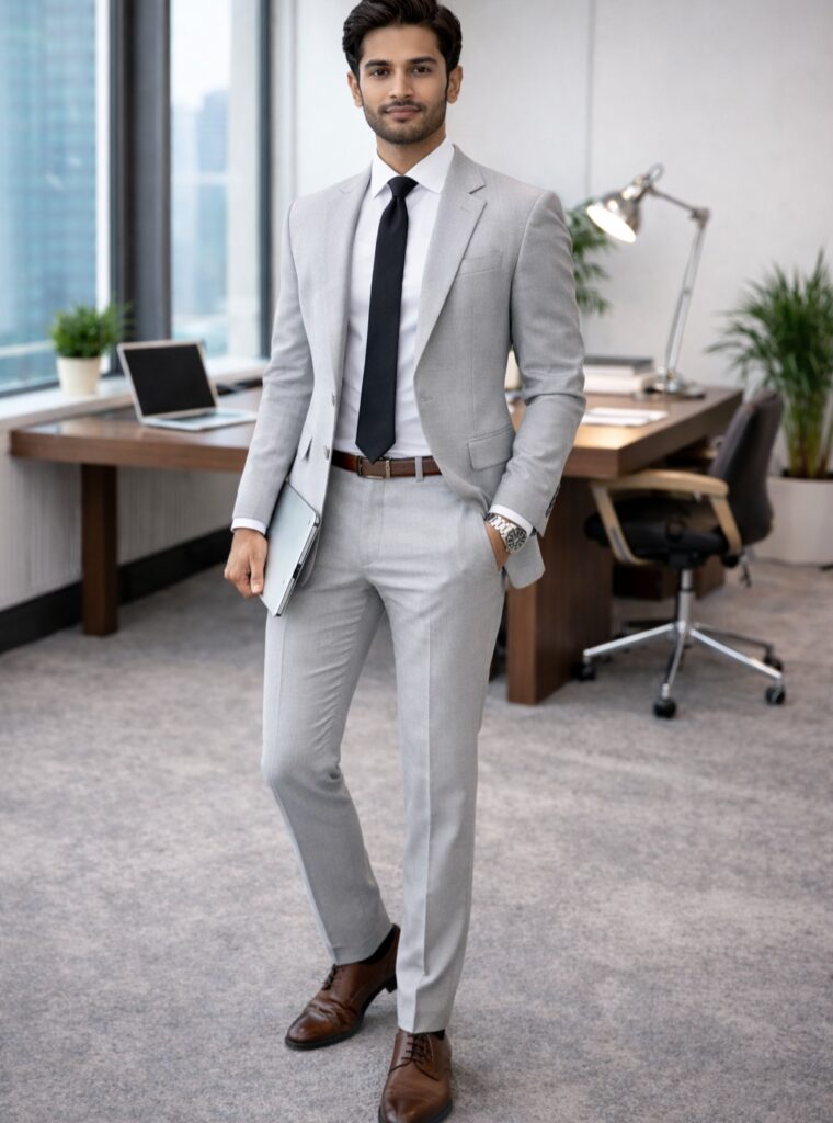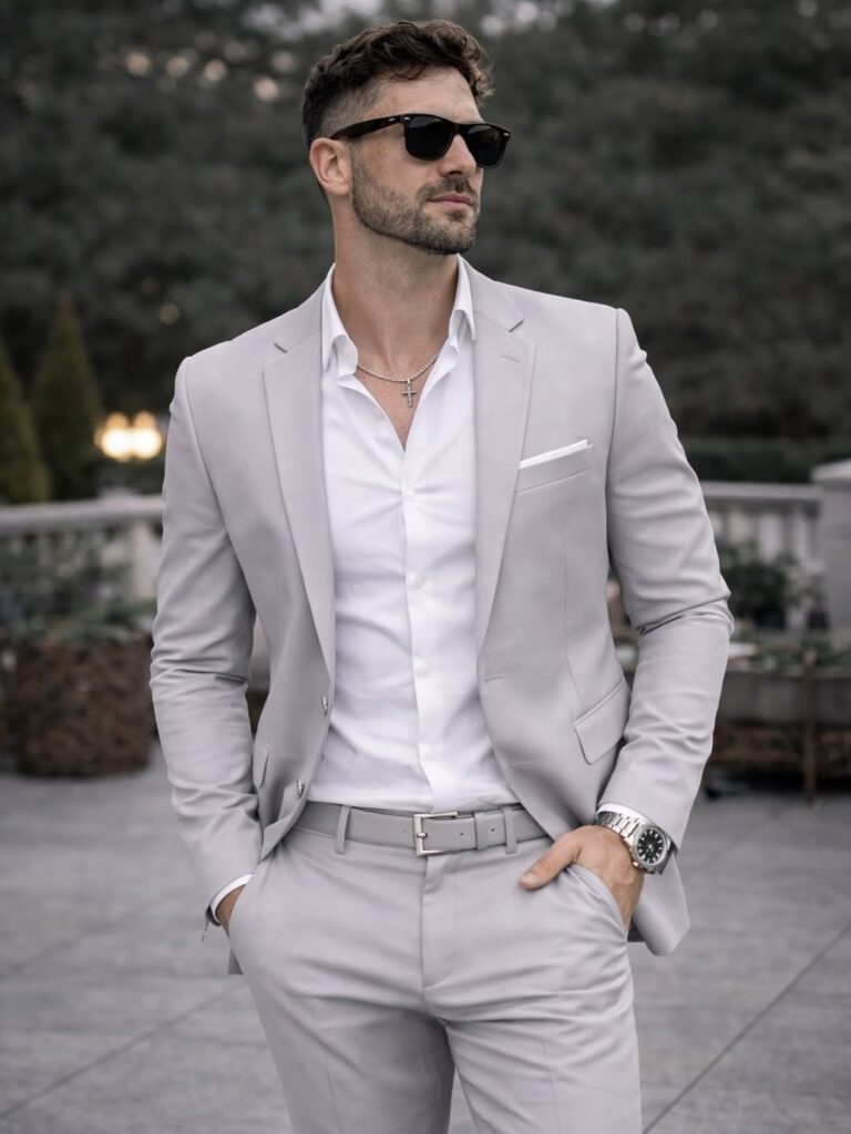 A tonal grey suit worn without a contrasting shirt or tie — a mid-grey suit with a lighter grey shirt, no tie, clean grey or white shoes — is the monochrome approach to formal dressing that reads as considerably more forward-thinking than the conventional dark suit and white shirt combination. The tonal grey removes the visual interruption of a contrasting shirt, which allows the suit’s silhouette and fabric to do all the work without being divided at the collar and lapel by a color break. The result is a formal outfit that looks cohesive and architectural in a way that a contrasted suit does not quite achieve. It photographs exceptionally well for formal occasions — weddings, events, professional environments — because the single tonal range reads clearly and consistently at every distance. A white pocket square is the one accent that works within this combination without breaking the monochrome logic, because the white is close enough to the grey palette to feel continuous rather than contrasting.