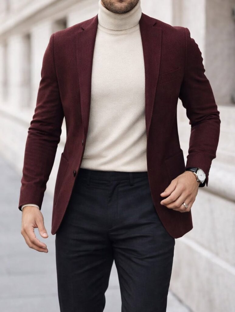 Burgundy is the most adventurous of the monochrome outfit choices on this list because it is a color that men’s fashion does not commonly build full outfits around, which means an all-burgundy look immediately reads as considered and deliberate in a way that more common monochrome colors do not. A burgundy shirt or knit with burgundy or deep plum trousers and dark wine-colored leather shoes creates a rich, deep tonal outfit that has a warmth and a confidence that cooler neutrals like grey and navy never quite achieve. The range within burgundy — from a pale rosewood through to a deep oxblood — provides the tonal variation needed to make the monochrome work as an outfit rather than a uniform. It suits autumn and winter contexts particularly well where the depth of the color works with the season, and it suits men with olive or darker skin tones especially well because the warmth of the burgundy palette reads naturally against those complexions.