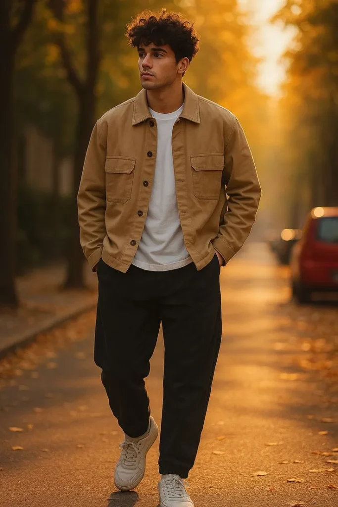 An overshirt — a shirt worn open over a plain t-shirt, treated more like a light jacket than a shirt — is one of the easiest ways to add a layer to a casual outfit without it looking complicated. The overshirt gives the outfit a bit of structure without committing to a blazer, and the t-shirt underneath keeps everything relaxed. Overshirts in flannel, cotton twill, or even light denim all work well. Wear it open, roll the sleeves up slightly, and pair with dark jeans or chinos. It’s a combination that looks better than the sum of its parts.