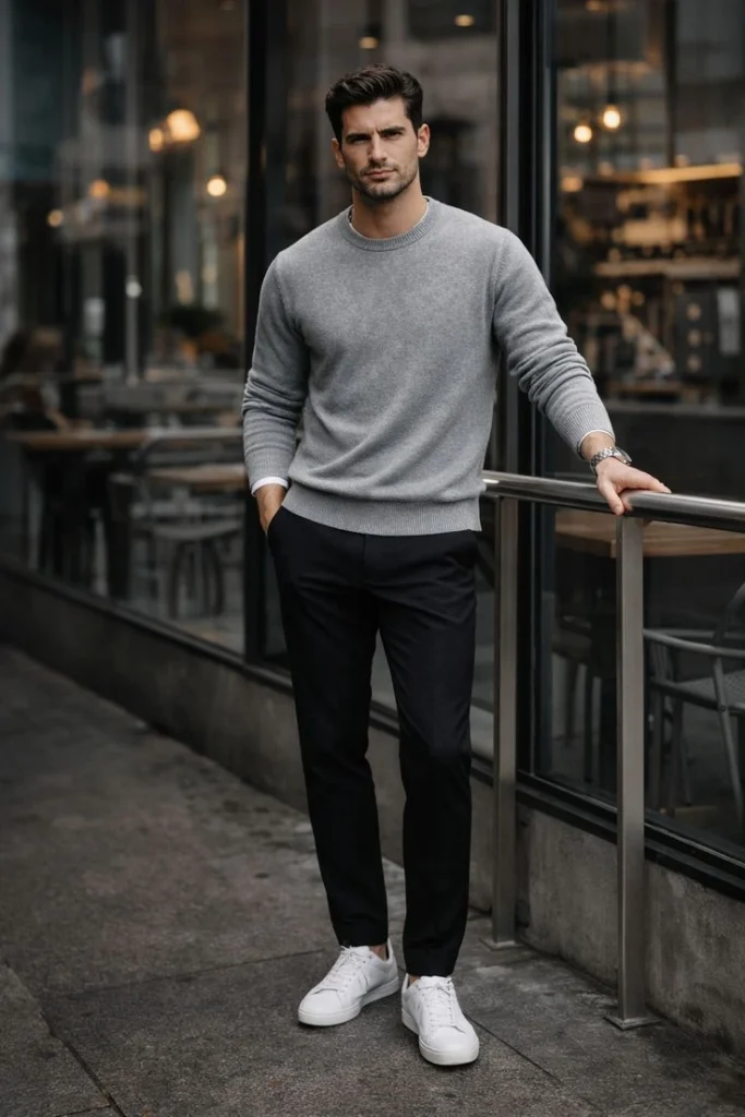 A grey sweatshirt is one of the hardest-working pieces you can have in a wardrobe. It goes with almost everything, it’s easy to wear, and when it fits properly — not oversized to the point of shapelessness — it looks intentional rather than lazy. Pair it with dark slim jeans and clean white or grey sneakers and the contrast between the casual top and the darker, slightly sharper bottom creates a balance that holds together well. It’s the kind of outfit that takes about thirty seconds to put on and looks like it took more thought than that.