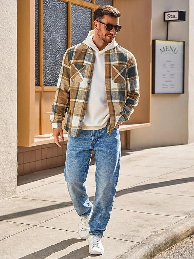 Wearing a shirt unbuttoned over a plain t-shirt is a styling move that’s been around for a long time because it genuinely works. The open shirt acts almost like a jacket — it adds a layer and a bit of shape without making the outfit feel heavy. The t-shirt underneath should be plain and fitted, and the overshirt can be patterned or textured since the base is neutral. Flannel shirts, denim shirts, or even a light linen shirt all work in this role. With jeans and sneakers, it’s an easy casual look that never reads as underdressed.