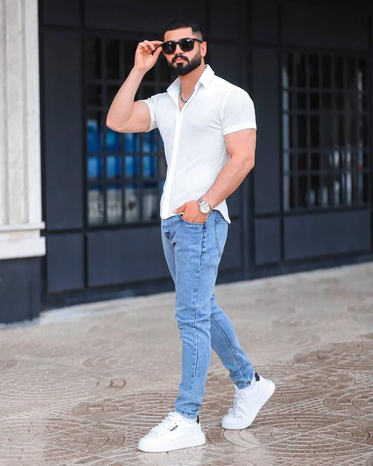 It sounds almost too simple to mention, but a clean white t-shirt with well-fitted blue jeans is genuinely one of the best outfits a man can own. The reason it keeps showing up everywhere is because it works on everyone, for almost every casual occasion, without requiring any thought. The t-shirt needs to fit right — not too baggy, not too tight — and the jeans should be a clean, unfaded pair. Add white sneakers and that’s the whole outfit. It’s the kind of look that reads as effortless because it actually is.