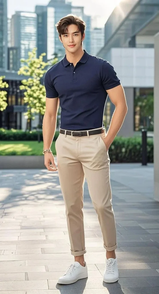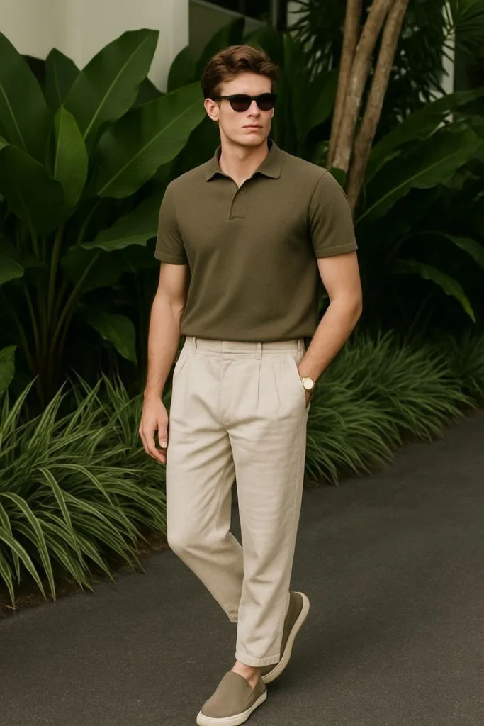 A polo shirt is one of those pieces that handles the gap between casual and smart without making it feel like a compromise. It’s more structured than a t-shirt but less formal than a button-down, which puts it in a useful middle ground for everyday wear. Pair a well-fitted polo in navy, white, black, or forest green with chinos in a complementary shade and add leather loafers or clean white sneakers. The outfit works for a weekend lunch, a casual meeting, a family gathering — basically anything that’s not jeans-and-tee territory but also not formal.