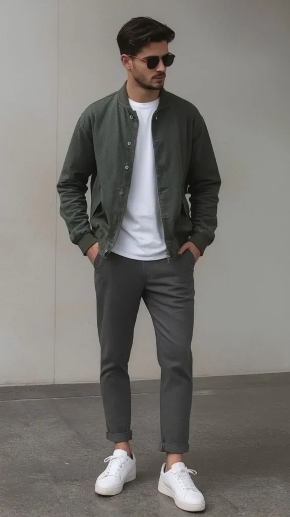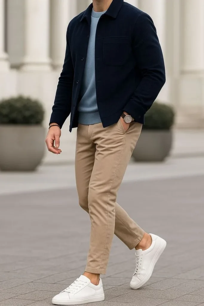 Chinos are one of the most underused pieces in most men’s wardrobes. They’re smarter than jeans but relaxed enough for everyday wear, and a plain t-shirt tucked loosely into them — or just worn untucked if the fit allows — gives the whole look a clean, considered quality. Stick to chinos in tan, navy, olive, or grey and pair them with a t-shirt in a complementary neutral. Add leather shoes or clean sneakers depending on where you’re going. It’s an outfit that works for more situations than you’d expect given how simple it is.