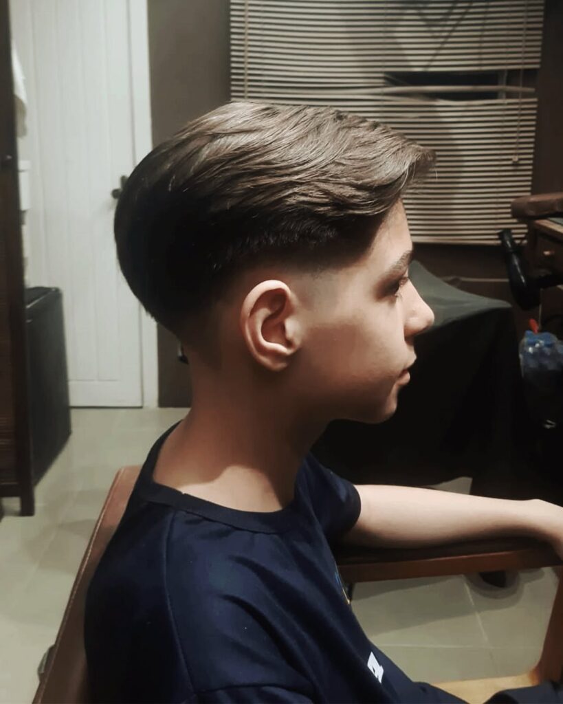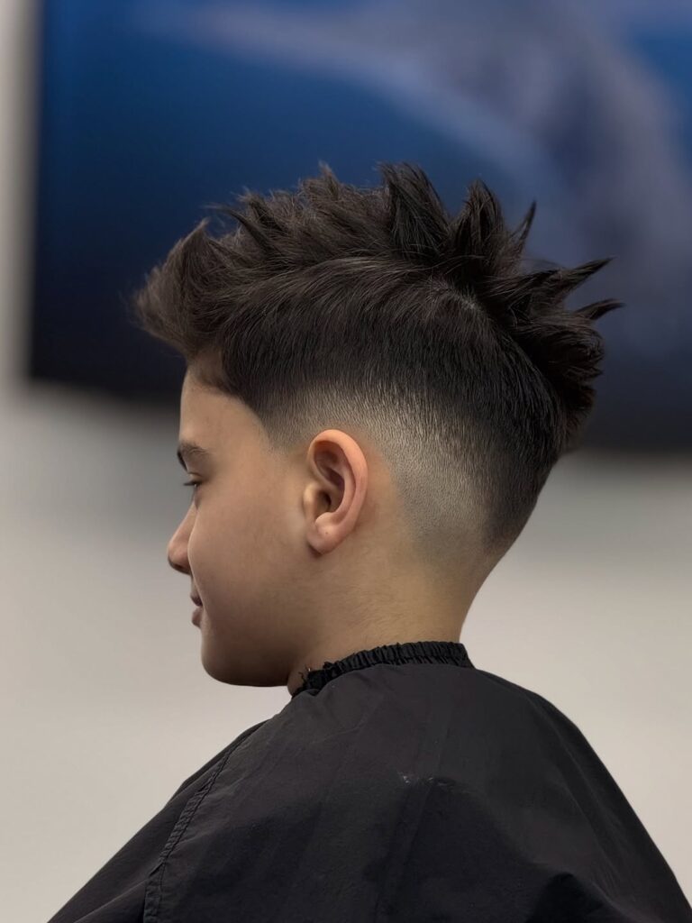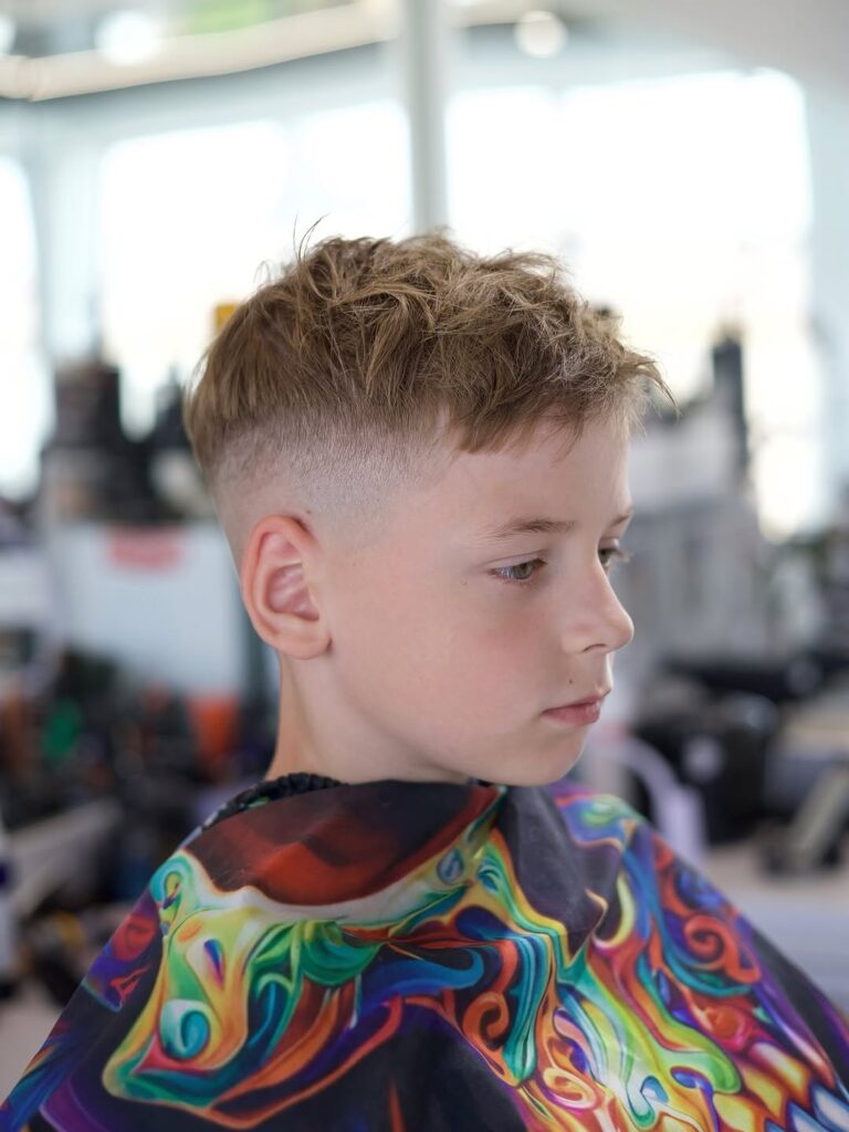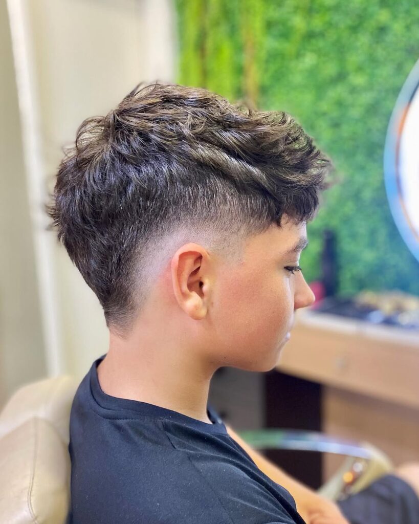 A messy textured top with a fade is perfect for boys who prefer a relaxed and natural style, as the textured hair on top adds movement while the fade keeps the sides clean, allowing the haircut to look good without requiring much effort or daily styling.