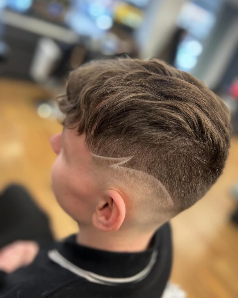 A line up with a shaved design allows boys to express their personality through subtle patterns or lines added to the haircut, while the clean edges and fade keep the overall style neat, making it one of the most fun and personalized summer haircut options.