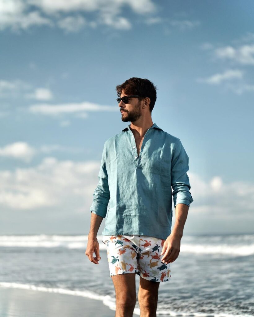 Swim shorts can easily become part of a stylish summer outfit when they have the right fit and length. Choosing mid-thigh swim shorts with a tailored shape makes them look intentional rather than purely functional. Pairing them with a fitted T-shirt or an open linen shirt creates a relaxed beach outfit that can transition smoothly from the beach to a casual lunch or walk along the coast.