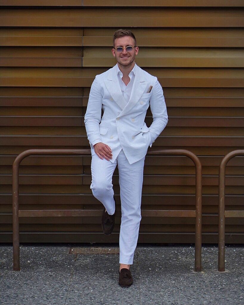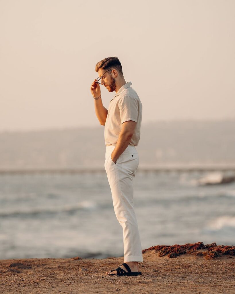 An all-white linen outfit creates a clean and refreshing summer style that looks modern and confident. Wearing a white linen shirt with white linen trousers allows the fabric texture to add visual interest while keeping the outfit light and breathable. White sneakers or light-colored sandals complete the look and make it perfect for beach vacations, summer parties, or warm evening gatherings.