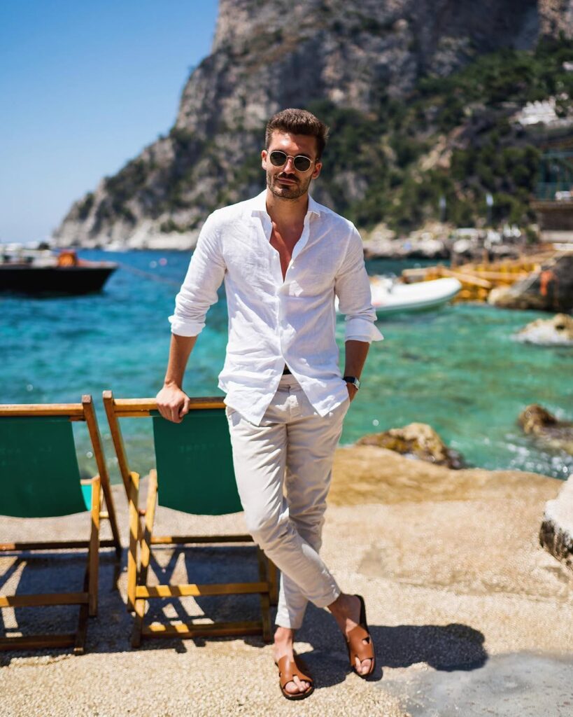 12. Neutral Chinos with White Shirt and Sandals – Mediterranean Style