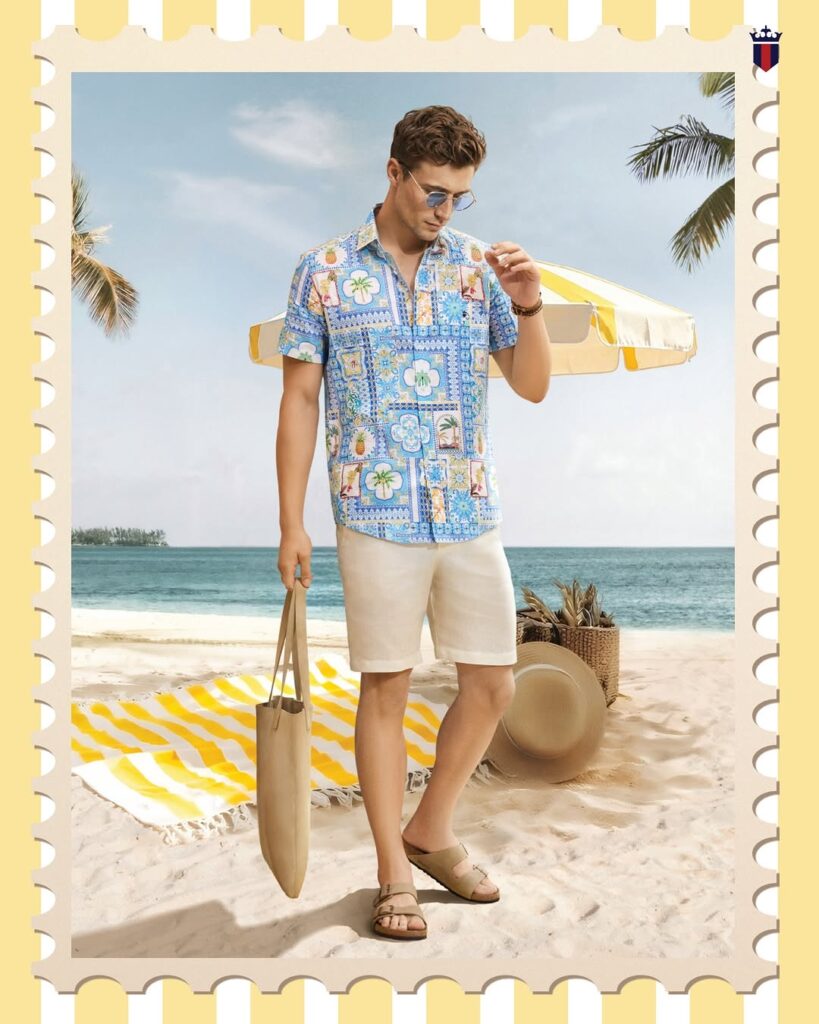 Resort wear outfits focus on relaxed fabrics, comfortable fits, and stylish summer colors. A lightweight printed shirt paired with linen trousers or tailored shorts creates a vacation-ready outfit that looks relaxed but intentional. Adding sandals or espadrilles completes the resort-inspired summer style.